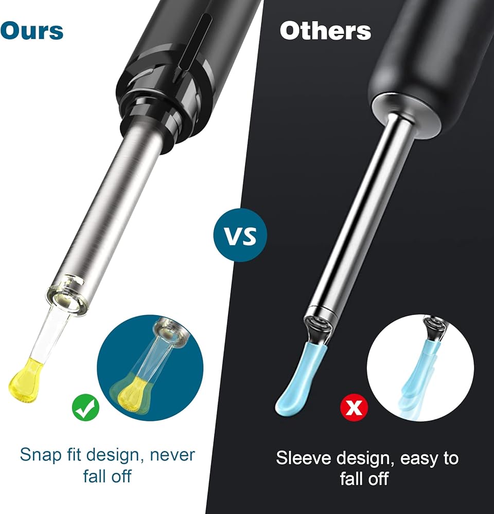 مجموعة تنظيف الأذن الجديدة: بالمقارنة مع الإصدار القديم من مزيل شمع الأذن اللاسلكي، فإنها تستخدم غلافًا مطاطيًا فضفاضًا لتغطية الملعقة المعدنية. من السهل أن يسقط هذا الغلاف المطاطي في قناة الأذن ويسبب مخاطر محتملة على السلامة. منظف الأذن الخاص بنا مصنوع من قالب متكامل من السيليكون ومثبت على الأنبوب المعدني بواسطة تصميم ملائم. لا تسقط أبدًا وليس من السهل كسرها.