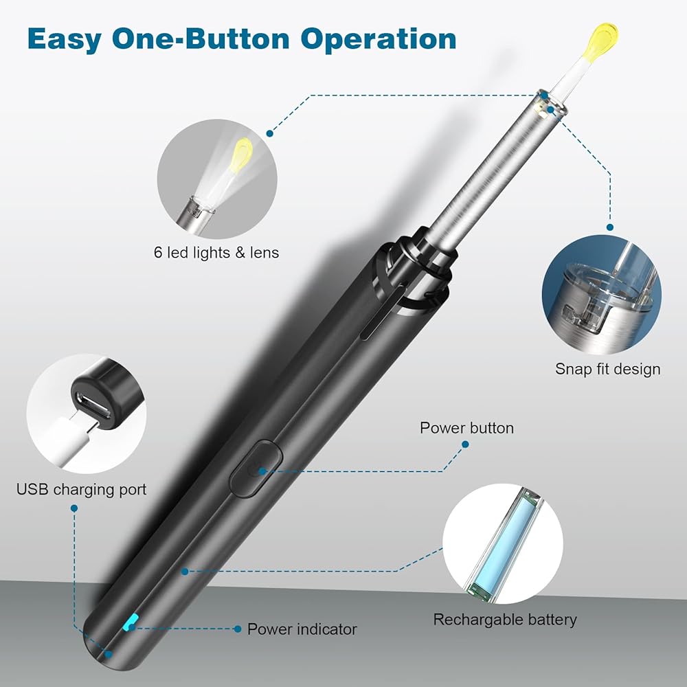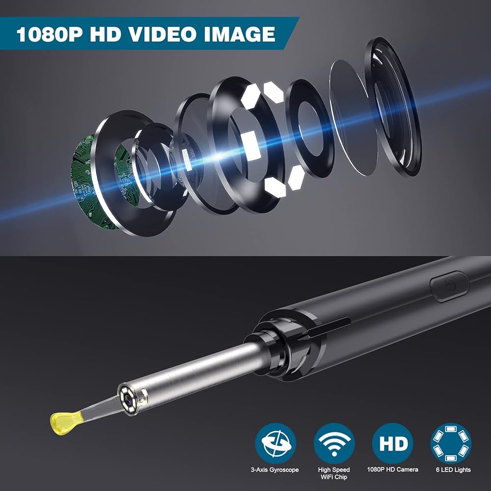 كاميرا عالية الدقة 1080 بيكسل وعدسة زاوية واسعة 360 درجة: تم تجهيز إزالة شمع الأذن هذه بعدسة زاوية واسعة 360 درجة و6 مصابيح LED حرارية، مما سيساعدك على إضاءة كل ركن من أركان قناة الأذن وإنشاء رؤية كاملة لفحص الحالة الصحية للأذن. ستقوم كاميرا الأذن عالية الدقة 1080 بيكسل الموجودة في منظف الأذن بالتقاط الصور ومقاطع الفيديو وعرضها في التطبيق حتى تتمكن من رؤية التفاصيل في الوقت الفعلي.