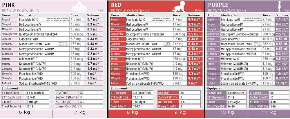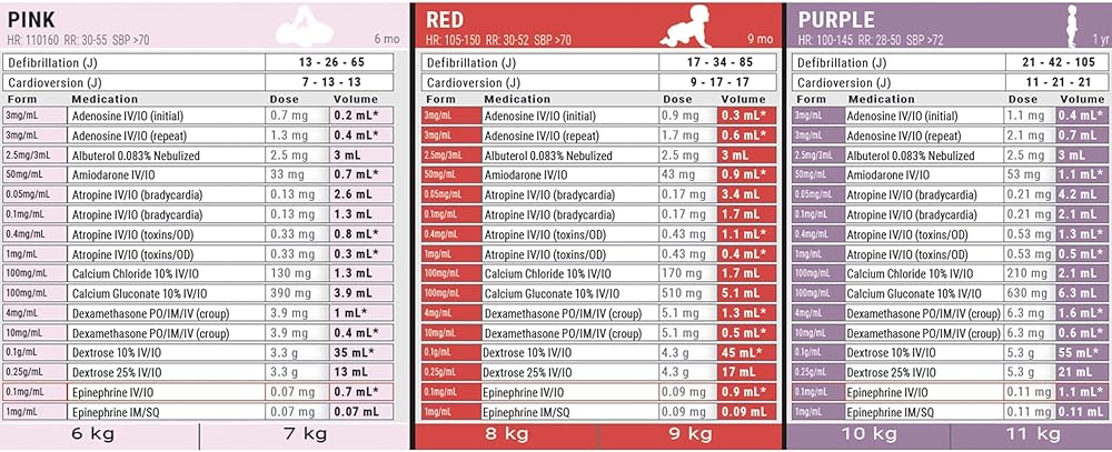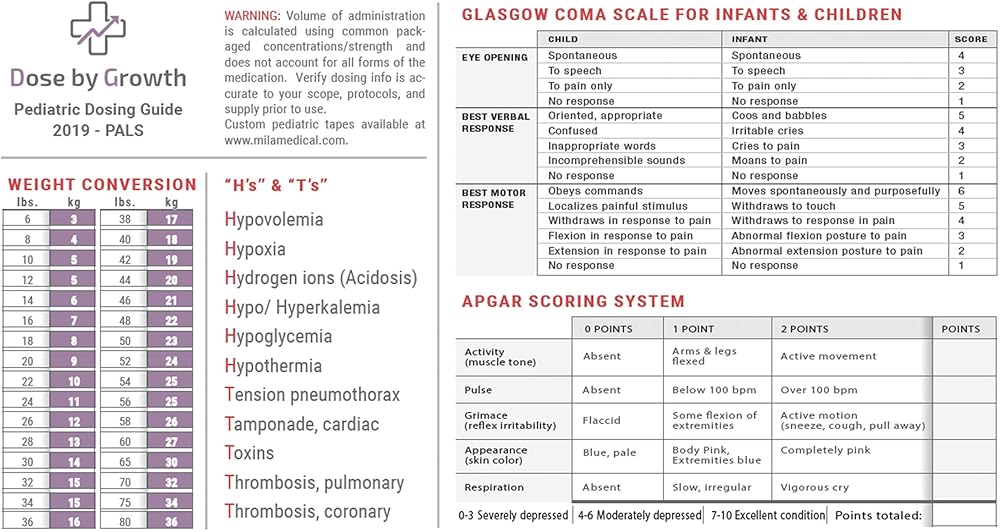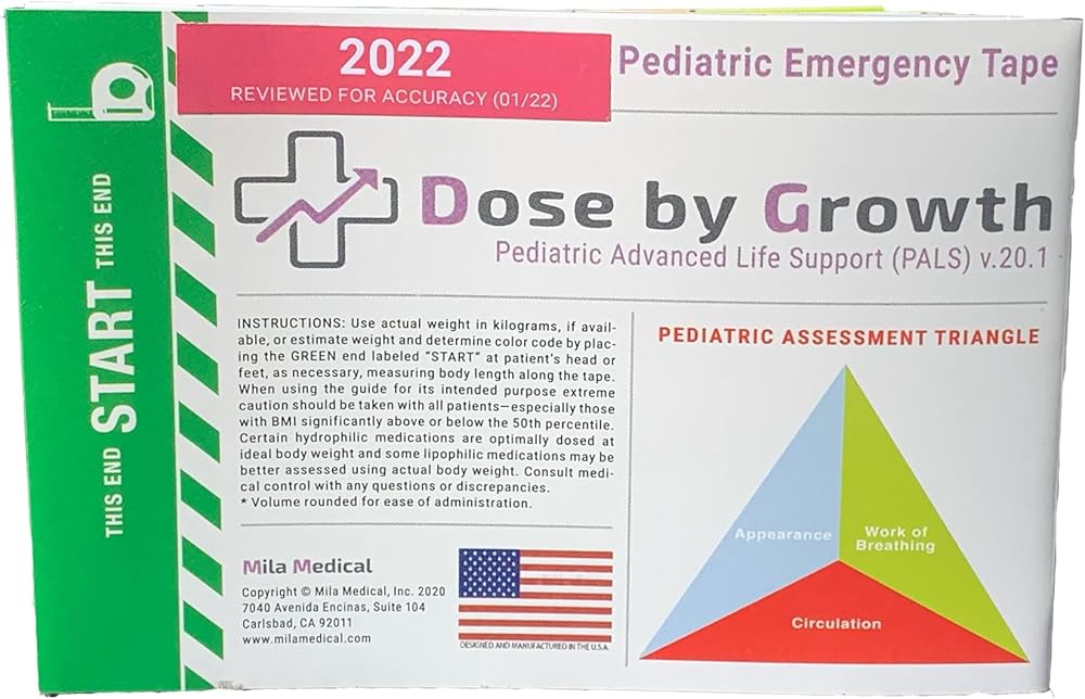 The Updated PALS Pediatric Emergency Tape (Last Reviewed for Accuracy in Jan 2022) is brought to you by Mila Medical, Inc. Featuring Pediatric Advanced Life Support (PALS) medications and dosing recommendations, Dose by Growth's PALS pediatric tape utilizes weight and color zones consistent with industry standards (i.e. Broselow tape) so it can work seamlessly into your existing system and be deployed tomorrow. Instill confidence among your personnel knowing that medication dosages are calculated based on the latest AHA PALS recommendations. If you're a medic, nurse or ems provider and have been trained to use the Broselow Tape, there is no additional training required.
