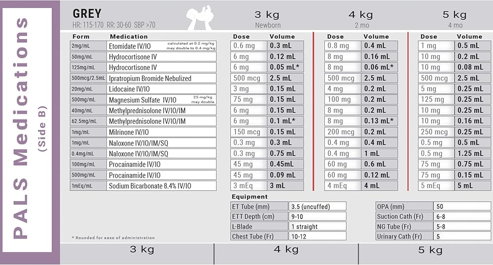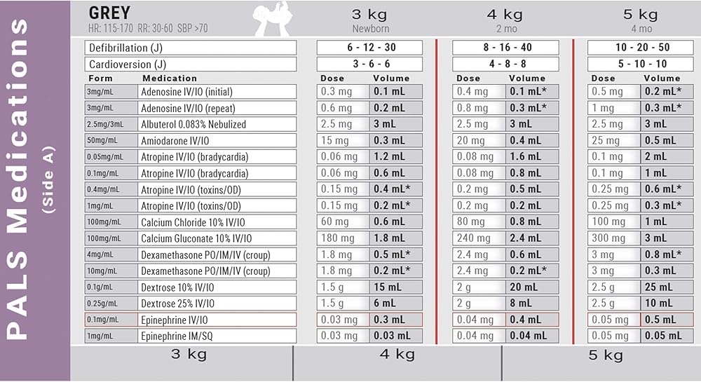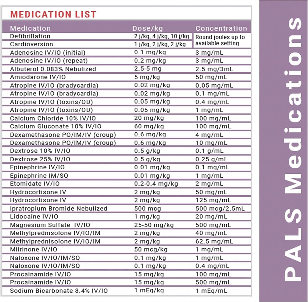 Pediatric Advanced Life Support (PALS) medication and dosage recommendations.