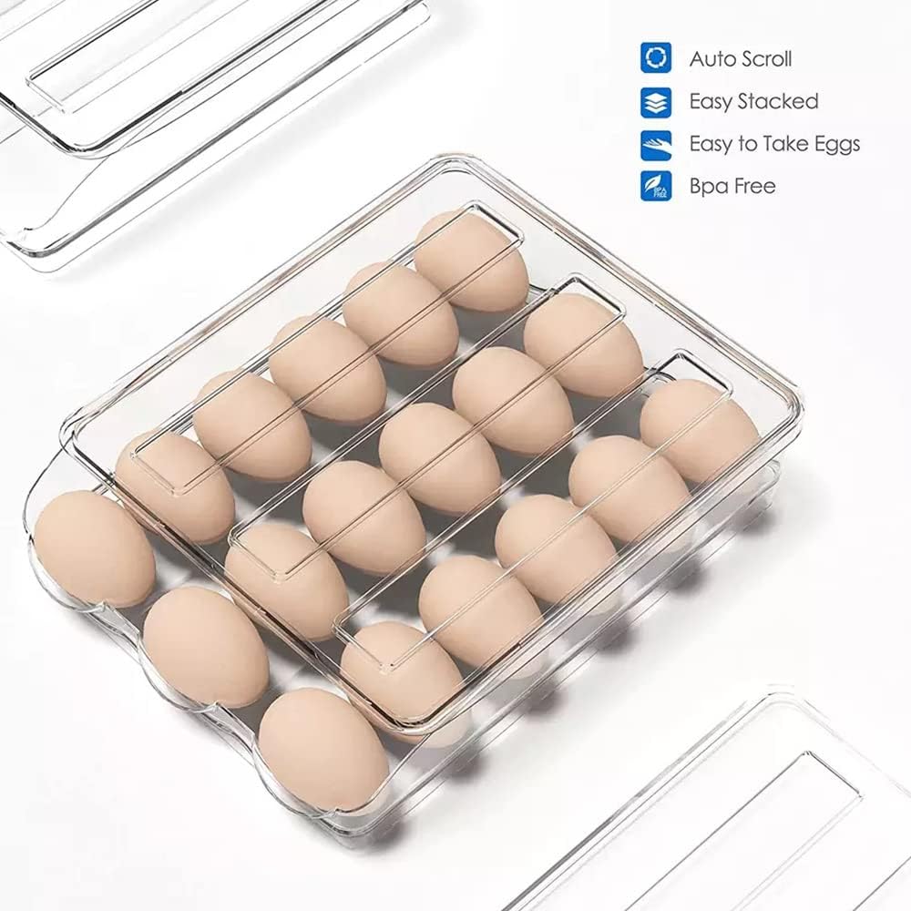 مزايا حاويات تخزين البيض، مواد بلاستيكية عالية الجودة آمنة غذائيًا تقوم بتمرير البيض تلقائيًا، لا حاجة إلى فتح الغطاء في كل مرة تأخذ فيها البيض، خاصة عند أخذ البيض من الثلاجة أو الخزانة المرتفعة. التصميم القلاب مقاوم للغبار وسهل التنظيف، وتصميم أخدود صينية البيض الشفاف مناسب للعرض، يمكن لكل طبقة تخزين 18-21 بيضة، مما يوفر مساحة أكبر.