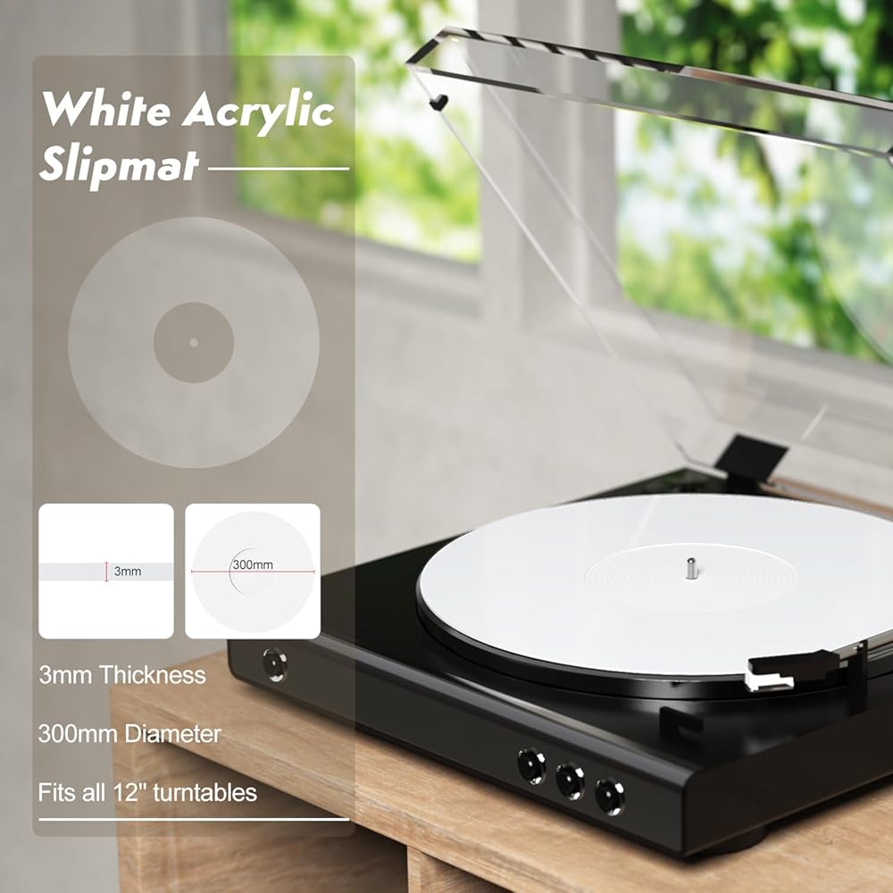 ترقية جمالية لبساط الانزلاق الدوار: طبق فينيل أكريليك أبيض يجعل الفينيل ملونًا وشفافًا. اللون الأبيض الخالد يضيء مساحة الاستماع الخاصة بك ويكمل أي ديكور. امنح القرص الدوار الخاص بك ترقية جمالية حديثة