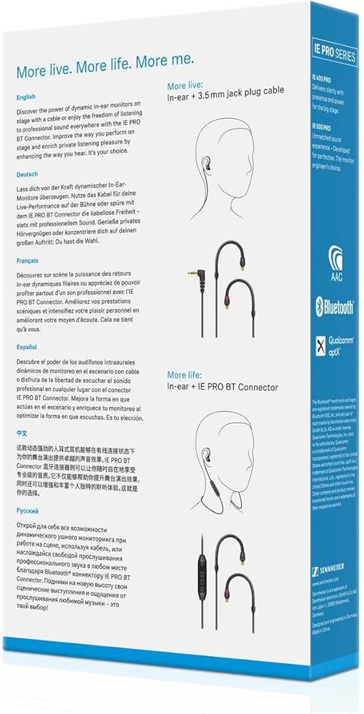 Developed for high expectations on live stages, the specially designed driver of the IE 100 PRO creates precise audio clarity for musicians in live sessions. Typical for the new type of membrane is a powerful, high-resolution and warm monitoring sound. With the included Bluetooth module, the in-ears become comfortable everyday companions for your mobile phone, PC or tablet. With the built-in mic, phone calls or Webcasts are also possible. Musicians and DJs choose the IE 100 PRO wireless set for its exceptional sound and high wearing comfort. Not only for live sessions, but also for producing on the road or as an everyday companion. The in-ears come with 4 earpiece adapters that optimize the fit for every ear size and shape. The setup is stage-safe from the connection to the cable conduit. Sophisticated monitoring sound for mixing on live stages, producing in the studio and everywhere in between. Developed for high expectations on live stages, the specially designed driver of the IE 100 PRO creates precise audio clarity for musicians in live sessions. Typical for the new type of membrane is a powerful, high-resolution and warm monitoring sound. With the included Bluetooth module, the in-ears become comfortable everyday companions for your mobile phone, PC or tablet. With the built-in mic, phone calls or Webcasts are also possible. Musicians and DJs choose the IE 100 PRO wireless set for its exceptional sound and high wearing comfort. Not only for live sessions, but also for producing on the road or as an everyday companion. The in-ears come with 4 earpiece adapters that optimize the fit for every ear size and shape. The setup is stage-safe from the connection to the cable conduit. Sophisticated monitoring sound for mixing on live stages, producing in the studio and everywhere in between.