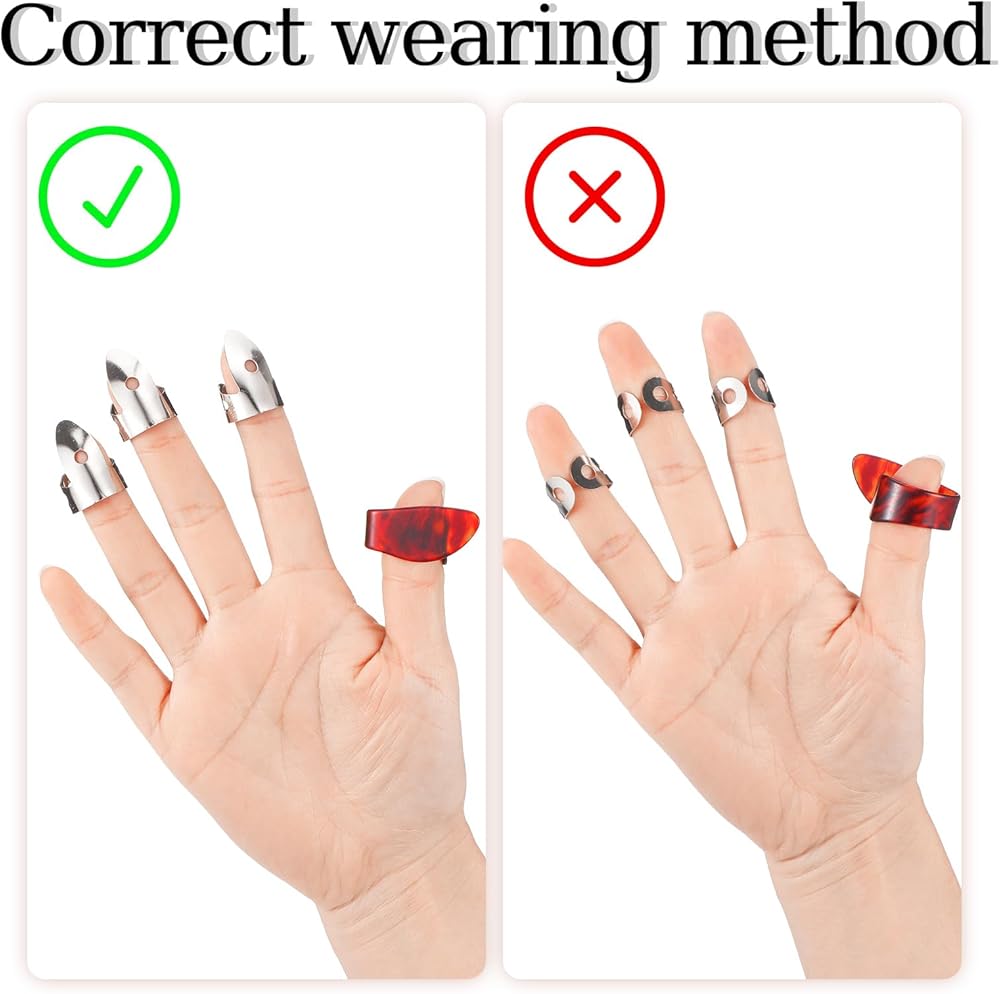 Flexible size: you have to fit the metal picks to each finger by bending the openings, the metal is pretty stiff, which is good for retain their shape; Please be careful of the size, this size is suitable for most adult fingers but please confirm the size of your fingers before ordering