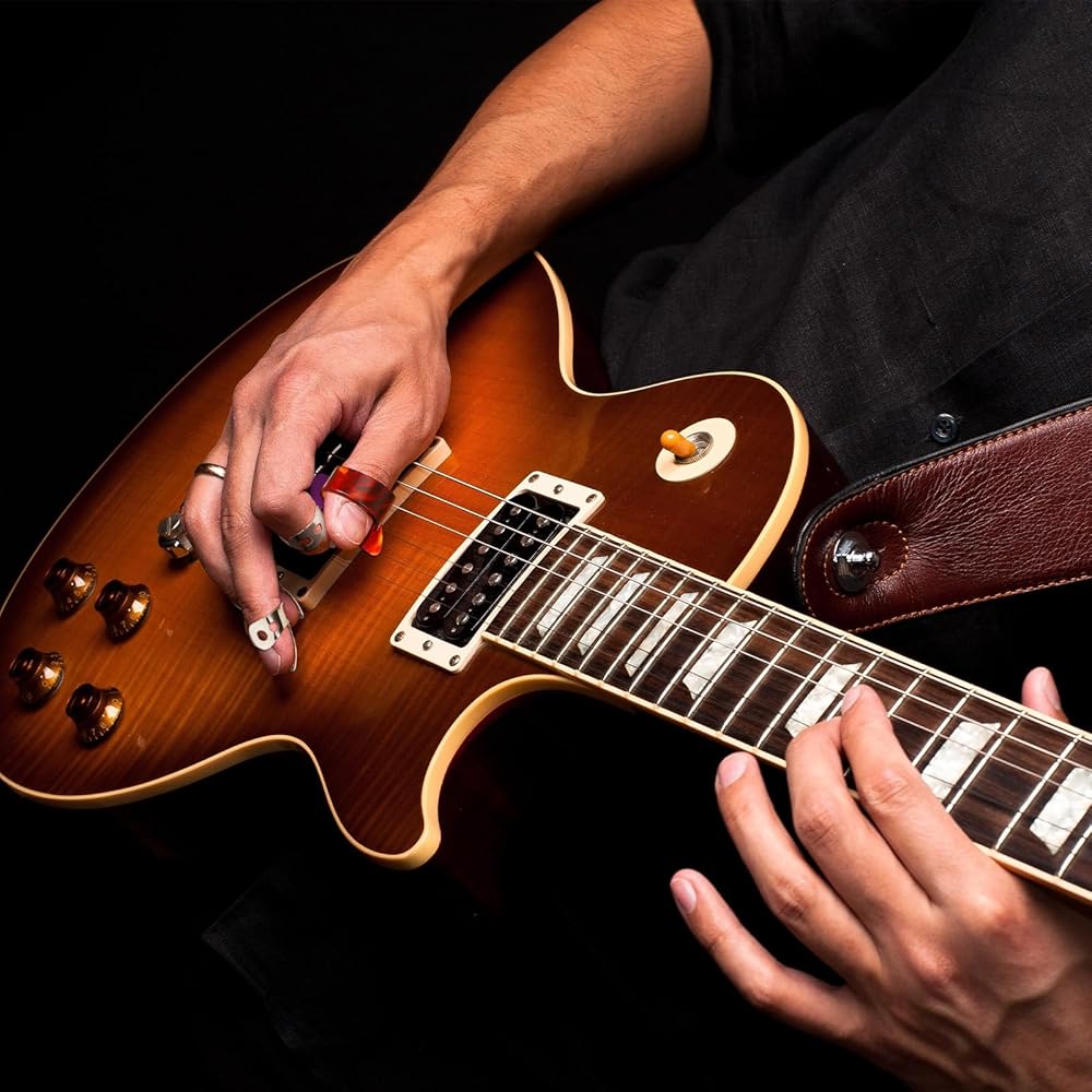 Fit most instruments: these guitar thumb and finger picks can be applied in playing electric guitar, acoustic guitar, classic guitar, bass, banjo, ukulele and so on, which help you quickly and effectively ensure the sound quality stable, strengthen guitar bass and graininess