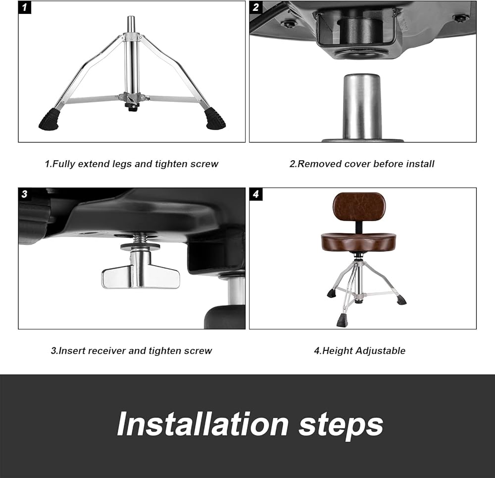 خطوات التركيب أولًا، افتح القاعدة المثلثة وشد برغي التثبيت السفلي. ثانيًا، نظف الجزء العلوي من القاعدة وقم بتركيب مقعد الطبل عليها. ثالثًا، قم بتركيب مسند الظهر وشد برغي التثبيت. رابعاً، قم بتدوير المقعد وضبط الارتفاع الذي تريده. أدخل الحلقة السوداء في فتحة الحد وقم بتثبيت البرغي بواسطة مفتاح الطبل. سطح من الجلد الصناعي سهل التنظيف والتخزين، يرجى استخدام منشفة جافة. كما أن التصميم القابل للفصل يجعل عربة الطبل أسهل في النقل والتخزين.