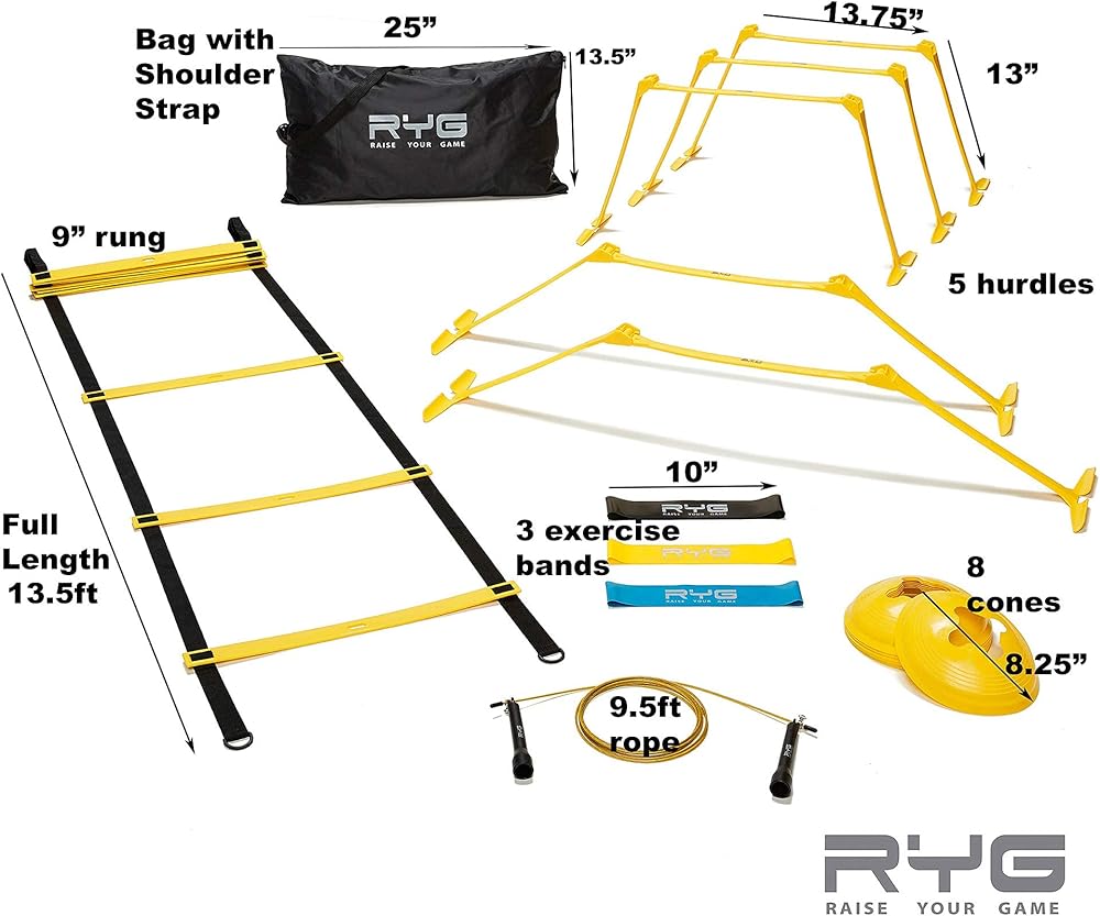 مجموعة تدريب اللياقة البدنية المثالية: تتضمن سلم خفة الحركة وخمس حواجز وثمانية مخاريط وحبل القفز وثلاثة أربطة صغيرة مقاومة للاتكس. المجموعة المثالية لأي نوع من أدوات الثقوب والمهارات.