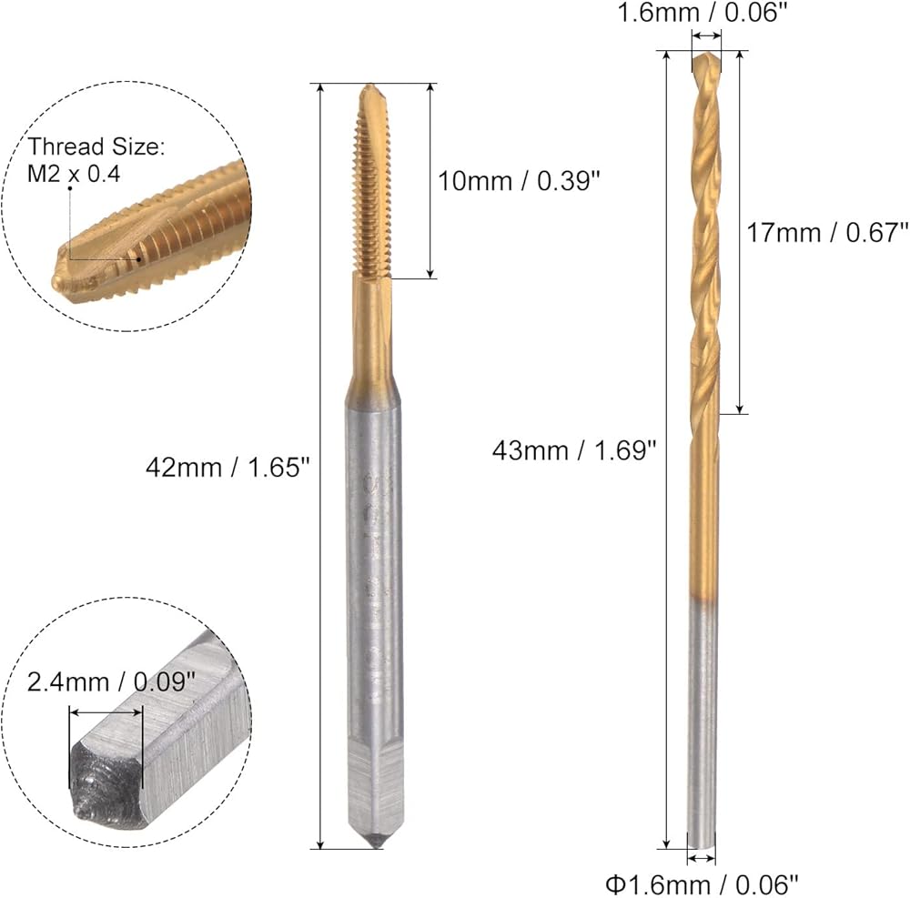 • Tap and Drill Bit: Tap thread size: M2.5 x 0.45, drill bit diameter: 2.1mm / 0.08". High-speed steel tool has high hardness and toughness for wear resistance. Good for general purpose applications.