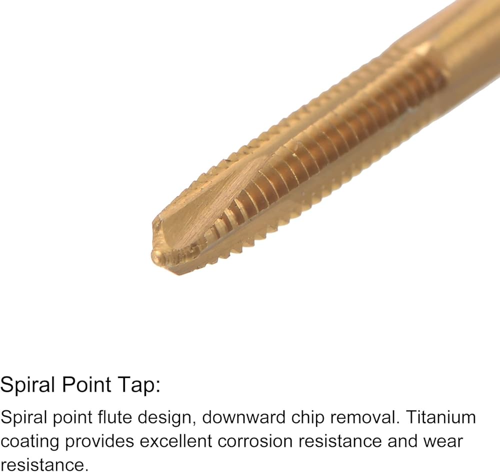 • Spiral Point Tap: Spiral point flute design, downward chip removal, right hand thread cutting, fast tapping with accuracy. Suitable for processing through-hole threads. For fast tapping in aluminum, die steel, stainless steel, bronze, hard plastics.