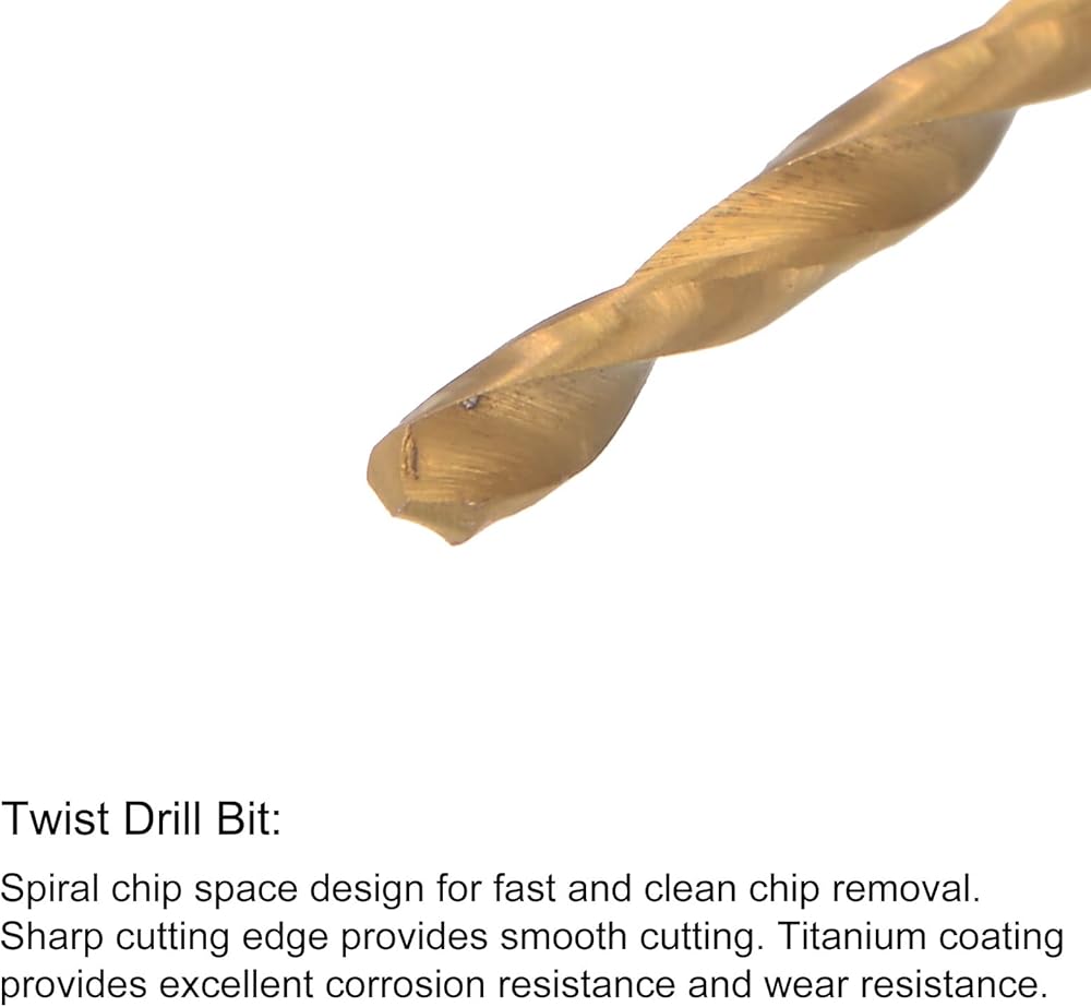 • Twist Drill Bit: Spiral chip space design for fast and clean chip removal. Sharp cutting edge provides smooth cutting and no glitches.Titanium coating provides excellent corrosion resistance and wear resistance.
