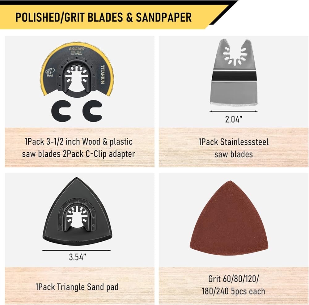 【Complete Oscillating Blades Kit】 This multi tool blades kit includes 2pcs x 1-3/8 inch saw blade, 2pcs x 1-3/4 inch saw blade, 1pcs x Extended 2-1/2" Saw Blade, 1pcs semi circular flush cut saw blade,1pcs x 2" stainless stell saw blade, 1pcs x Sand Pad, 25pcs x Sand paper, 2pcs x C-clip adapter, 1pcs x Storage box.