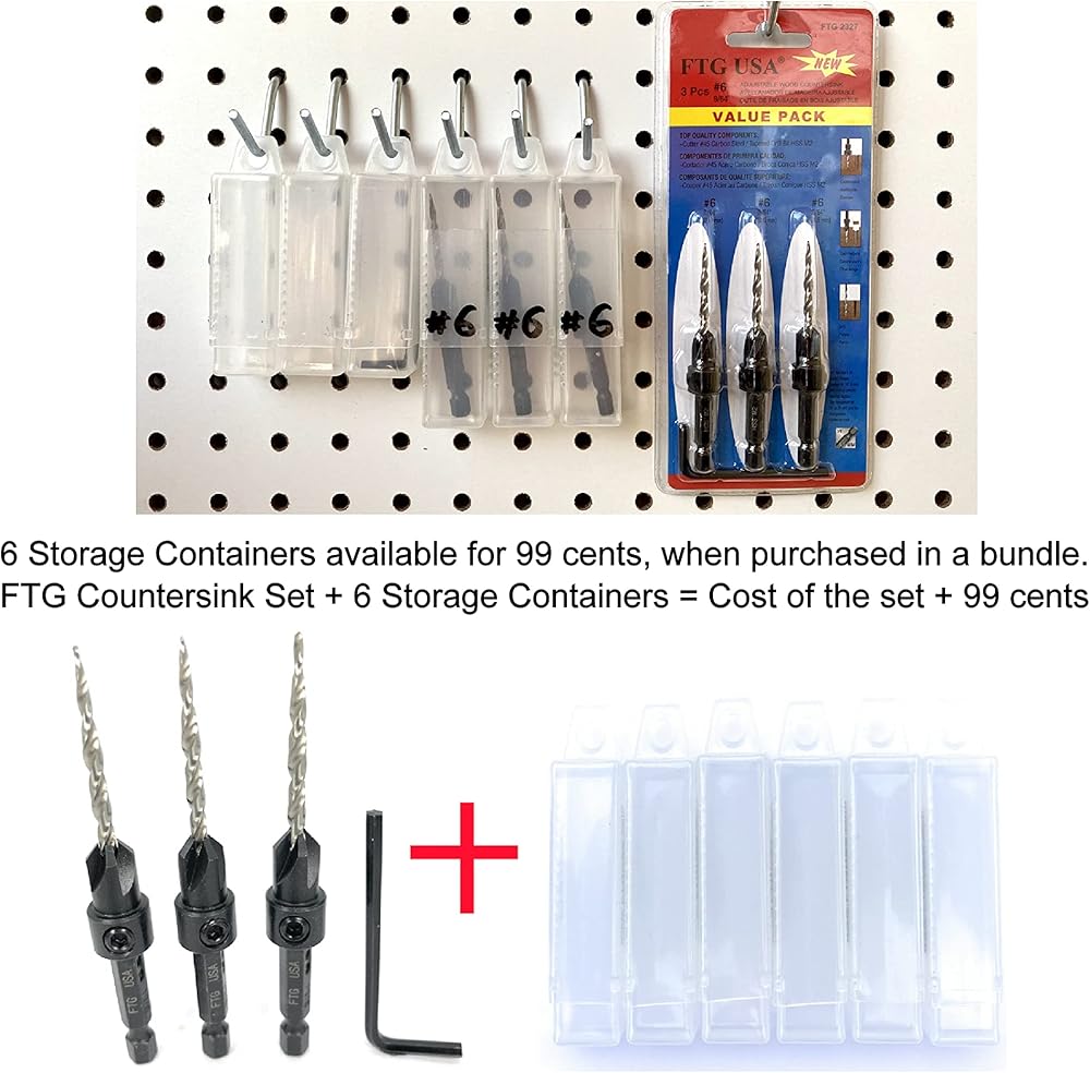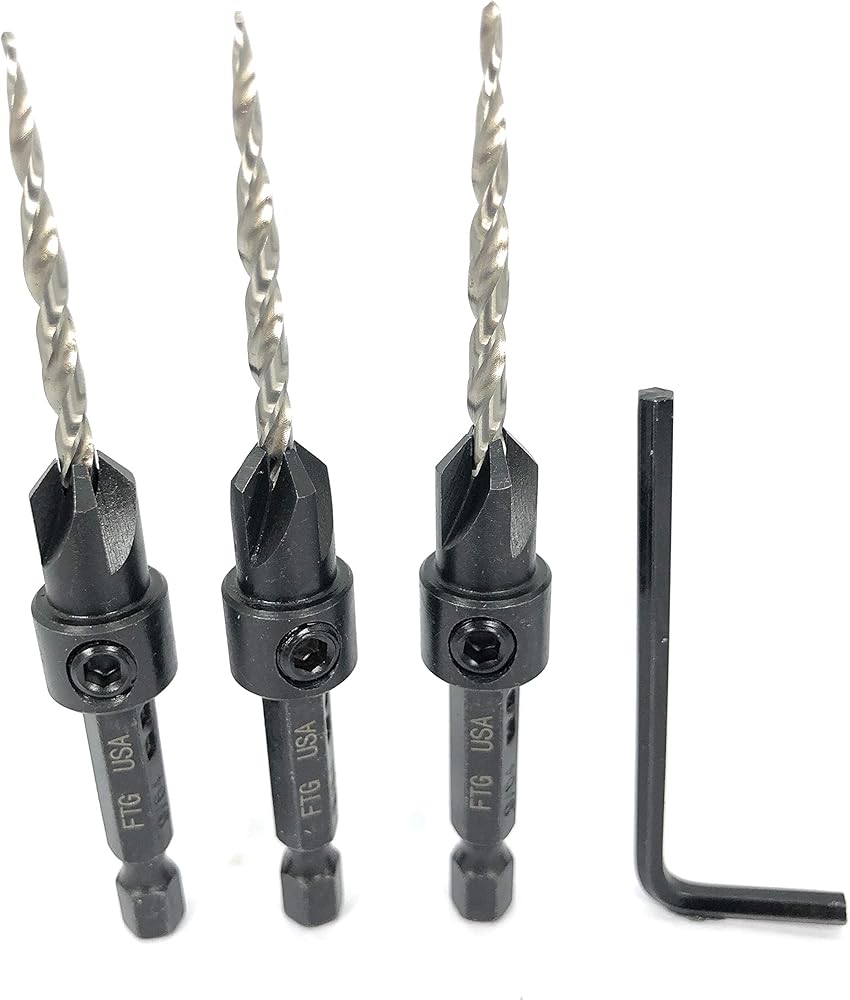 مجموعة لقم مثقاب غاطسة FTG USA 3 قطع #6 (9/64 بوصة) مجموعة لقم مثقاب غاطسة خشبية بنفس الحجم مع 12 لقمة بديلة #6 (9/64 بوصة) لقمة غاطسة مدببة، مع مفتاح ربط سداسي واحد،