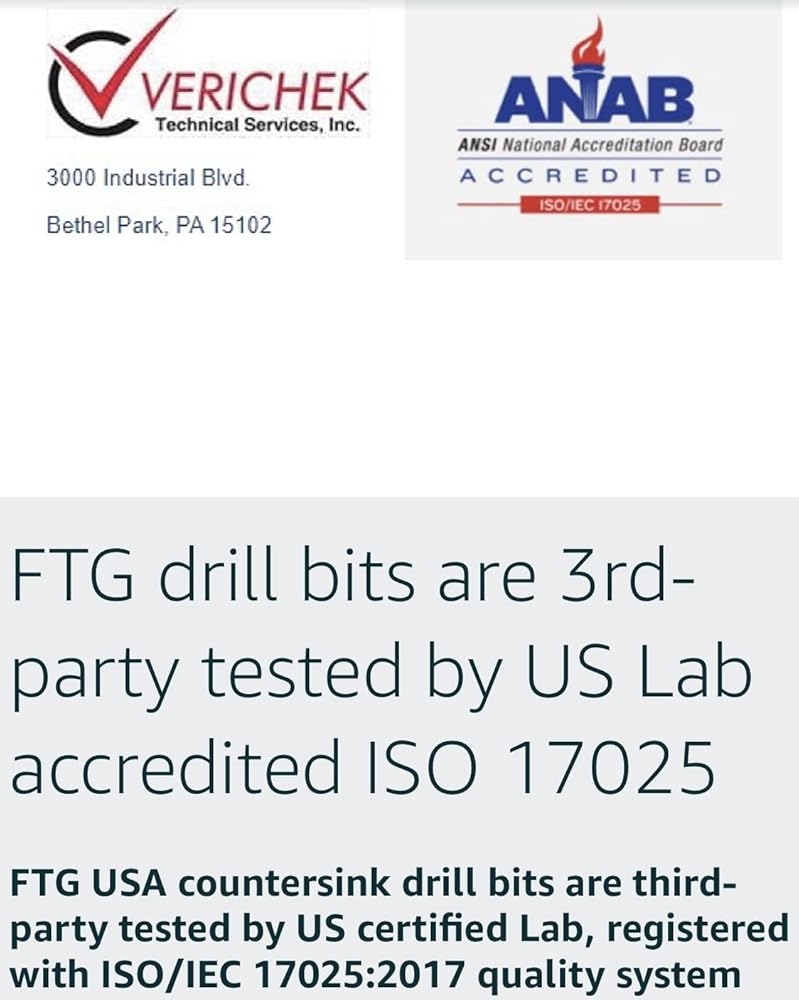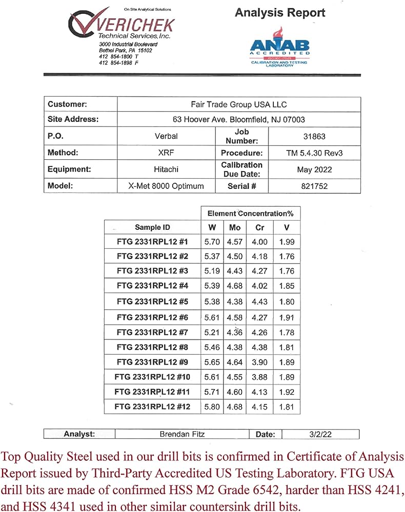 • حاويات التخزين لهذه المجموعة متاحة أدناه في هذه الصفحة في قسم "اجعلها حزمة". مجموعة رؤوس مثقاب مضادة مصممة في نيوجيرسي بواسطة Fair Trade Group USA وتم تصنيعها باحترافية في الصين بمواصفات FTG USA. يؤكد تقرير التحليل الصادر بتاريخ 27/04/2021 من قبل مختبر ANAB المعتمد في الولايات المتحدة، أن مجموعة لقم الثقب التي تحتوي على لقم غاطسة عالية الجودة من الفولاذ عالي السرعة تلبي المواصفات المطلوبة من HSS M2 Grade 6542، ومجموعة لقم الثقب أصعب من HSS 4241 وHSS 4341 المستخدمة في غاطسة مدببة أخرى مماثلة رأس المثقاب