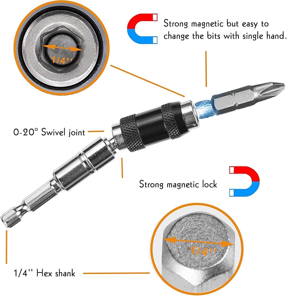 - Pivot magnetic bit holder fits 1/4" hex shank screwdriver bits or tips, used for collet or impact drivers, including electric screwdrivers, drills.