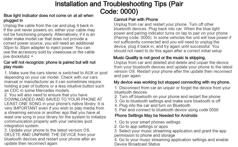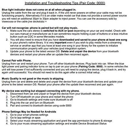التوصيل والتشغيل لا يحتاج إلى تركيب! ببساطة قم بتوصيله بمقبس ايبود/ميديا الموجود في سيارتك. في حالة وجود مشكلات بسيطة، يرجى التحقق من الصورة الثانية للحصول على إرشادات التركيب واستكشاف الأخطاء وإصلاحها. كما يشار إلى معلومات هامة عن المنتج فيما يتعلق بالتوافق أدناه.