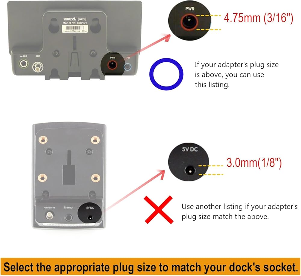 - Please take a look at the plug size before ordering, OD: 3/16" or 4.7mm, compatible with Sirius XM Radio Powerconnect Dcoking station adapter, fit Sporster Sdsp5v1 Stratus 6 7 Ssv7v1 Sadv2c Starmate 5 7 8 Sst8v1 Sdst5v1 St7tk1c Audiovox Xdnx1v1 Sxdv3 Xpress Xmp3i Xpmp3h1 Xmck30p Sxdpip1 Sdsv6v1 Sadv2 Xapv2 Xadv2 Sxvd1 Sx1ev1 Onyx Xdnx1 EZ Plus Xez1v1 XdPiv1 Xdpiv2 Lynx Lv1 Sxiv1SdsP6v1 Sdpiv1 Edge Sx1e XpressRci Xdrc2v1 SXEZR1V1