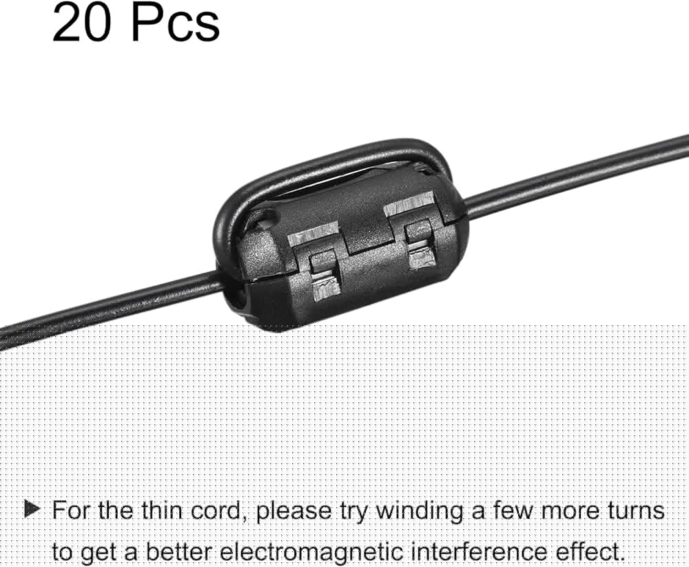 • تركيب بسيط، افتح المشابك وضعها في السلك، ثم أغلق مشابك قلب الفريت. للحصول على تأثير أفضل مضاد للتداخل، يمكن تقشير الغلاف الخارجي للسلك ولفه حول الحلقة لبضع مرات أخرى.