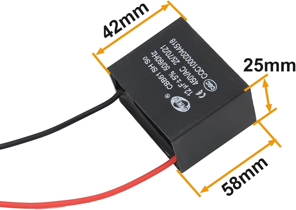 • المواصفات: الموديل: مكثف CBB61، السعة: 12 ميكروفاراد ± 5%، التردد: 50/60 هرتز، الجهد: 450 فولت تيار متردد، نطاق درجة الحرارة: 40/70/21.