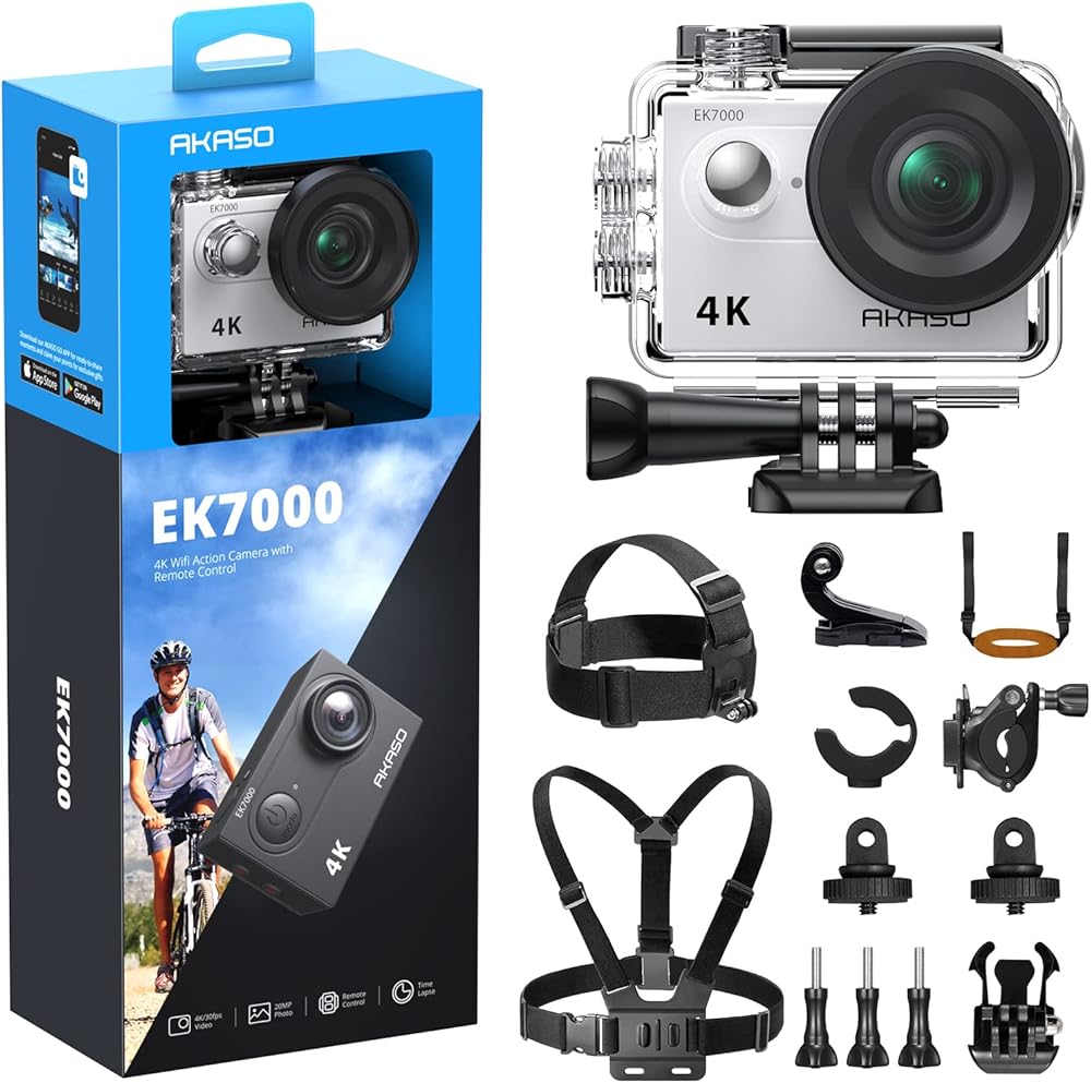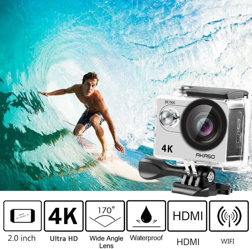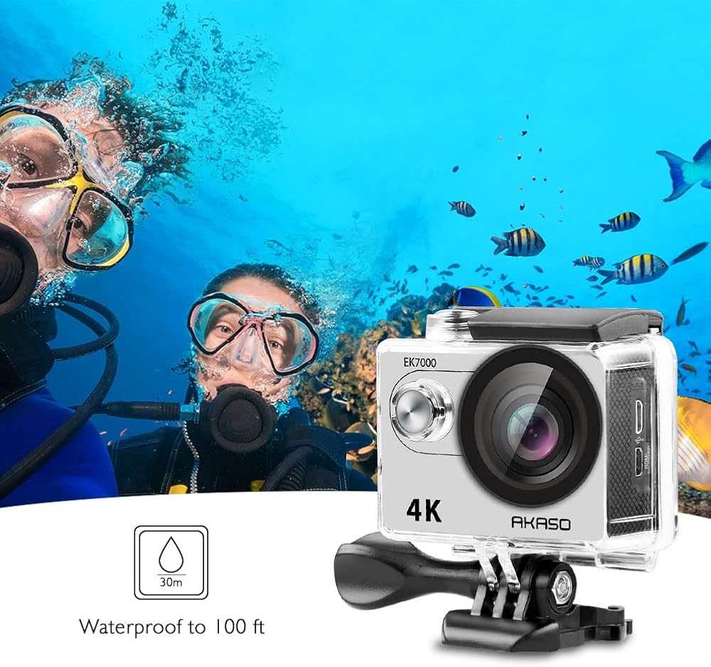 98 Feet waterproof camera. AKASO EK7000 is designed to withstand extreme environments, together with durable waterproof case. With the accessories, transform it for indoor and outdoor activities.