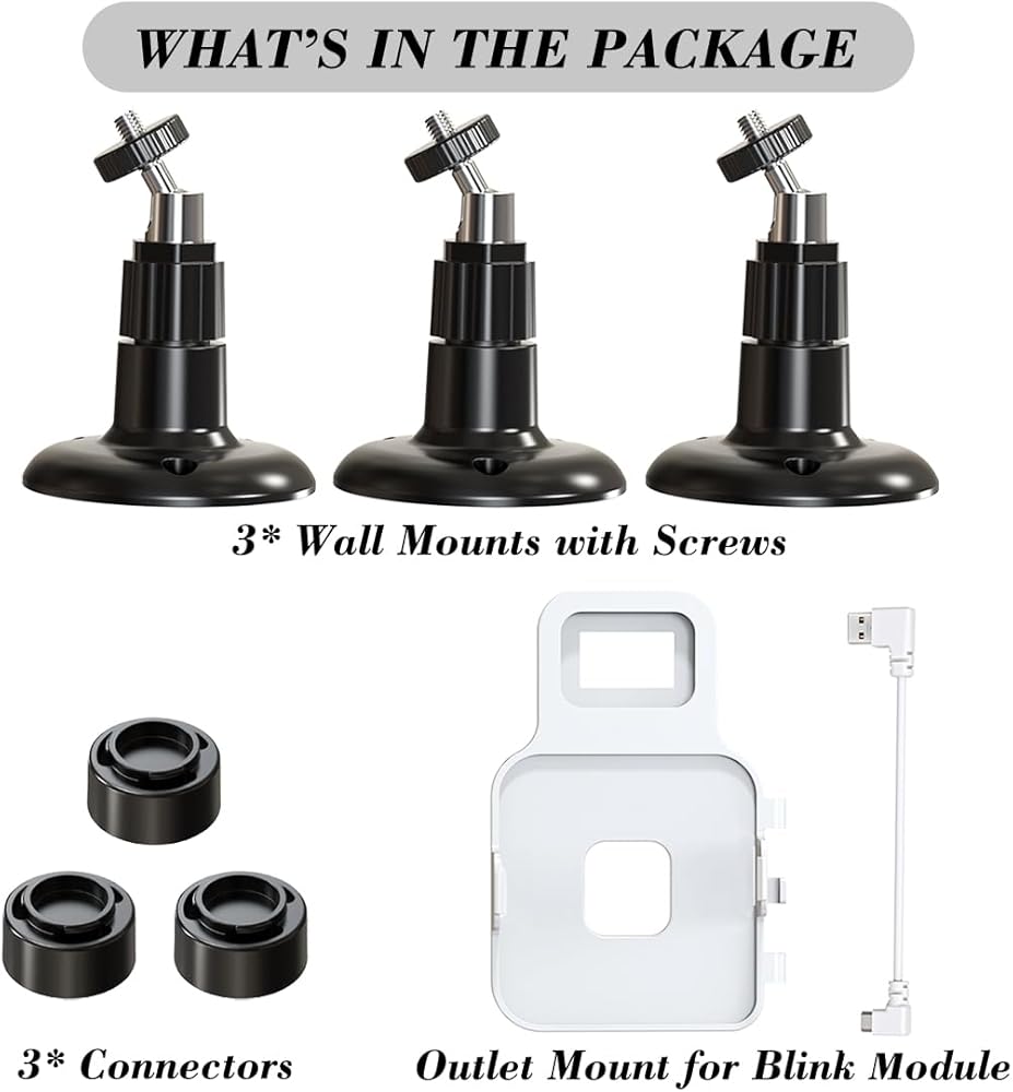 تحتوي العبوة على: 3 حوامل كاميرا خارجية من بلينك × 3 قطع، حامل جداري للمخرج لوحدة مزامنة وميض 2 × 1، ملحقات البراغي × 1 مجموعة، القابس والكاميرا غير متضمنين.