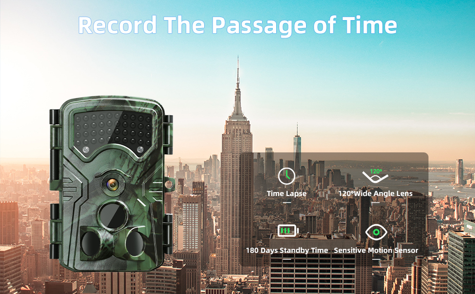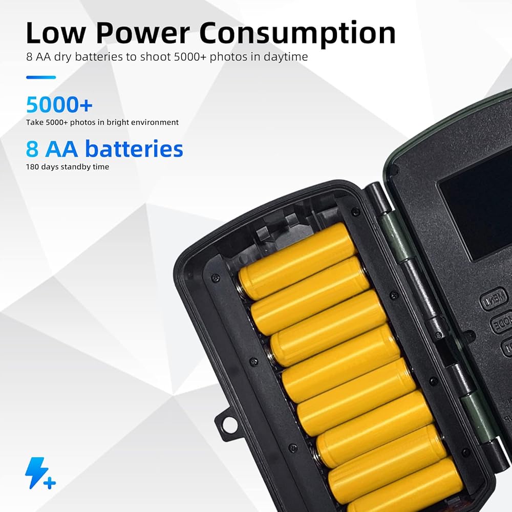 وقت استعداد ممتد - بفضل نظام إدارة الطاقة الفعال، تستخدم الكاميرا ذات الفاصل الزمني 8 بطاريات جافة AA لالتقاط أكثر من 5000 صورة في النهار، ويوصى بتوصيل مصدر طاقة خارجي DC-6V-2A 3.5 مم للتصوير ليلاً (البطارية و مصدر الطاقة الخارجي غير متضمن)