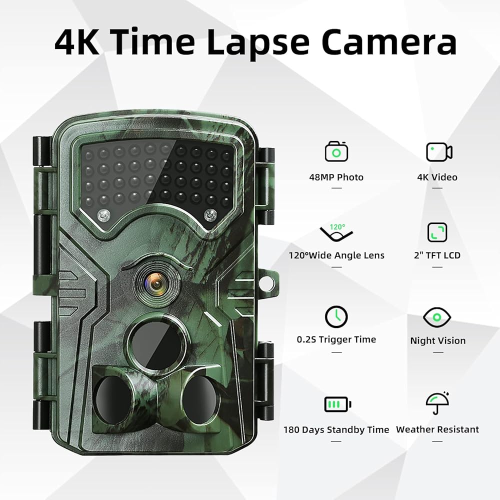 تصوير عالي الدقة: تم تجهيز الكاميرا الخارجية بفاصل زمني بمستشعر صور بدقة 48 ميجابكسل، مما يضمن التقاط صور ومقاطع فيديو مفصلة للغاية. تتيح إمكانية تسجيل الفيديو بدقة 4K التقاط لقطات فائقة الوضوح، مما يوفر تحديدًا وتحليلاً دقيقًا.