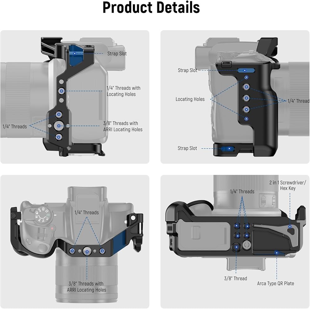 【Firm Installation By 3 Points】 The cage will firmly attach to your R8 camera via a 1/4" mounting screw and two anti twist pins that fix the camera's strap eyelets. A nonslip rubber pad protects the camera from scratches while adding extra stability