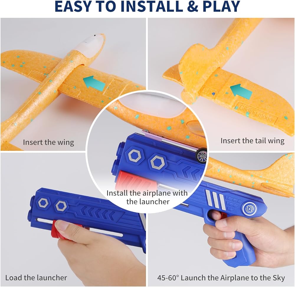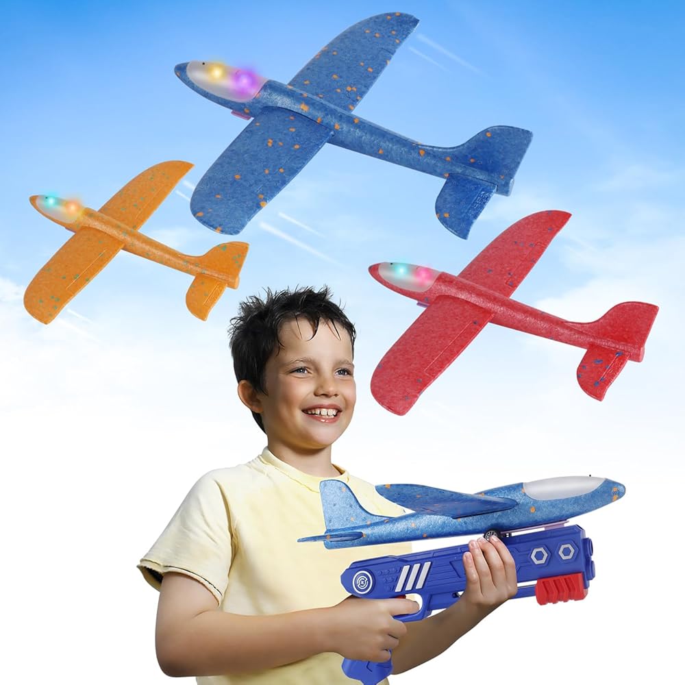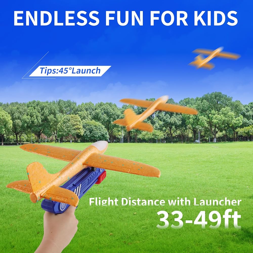 🎁3-piece airplane toy - Our gliding boy toy comes with three different colored red, orange, and blue gliding foam airplanes, as well as one airplane launcher. Children can develop their hand-eye coordination, observation skills, and sense of direction by throwing the airplane by hand or driving it with the launcher.Christmas Gift for kids.