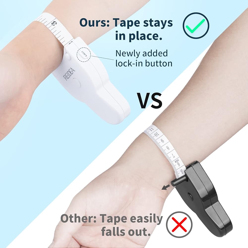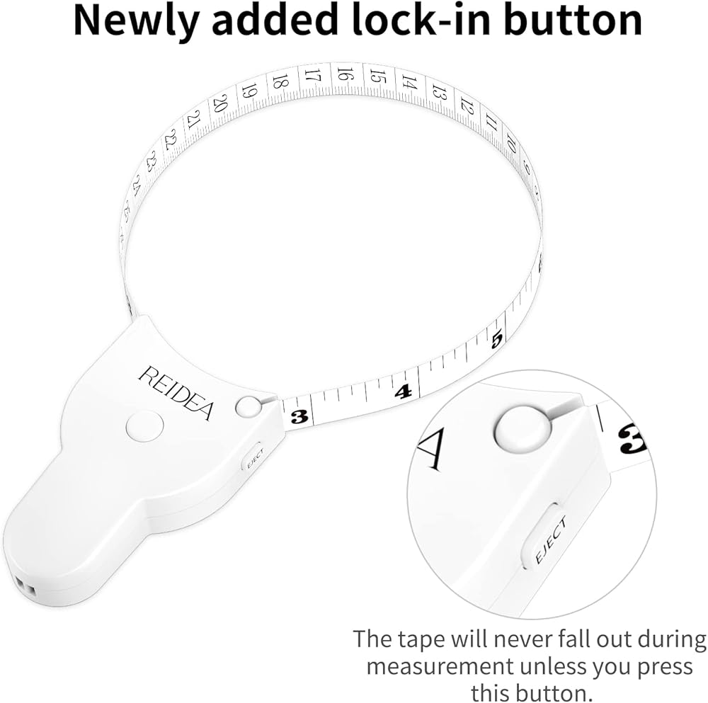 • ميزة سحب الزر وقفل الدبوس - للحصول على القراءات الأكثر دقة وإحكامًا، يتم تثبيت الدبوس في مكانه ويمكنك سحب الشريط للحصول على أفضل القياسات. تضمن ميزة السحب والقفل بالضغط على الزر القياس المناسب والدقة الفائقة.