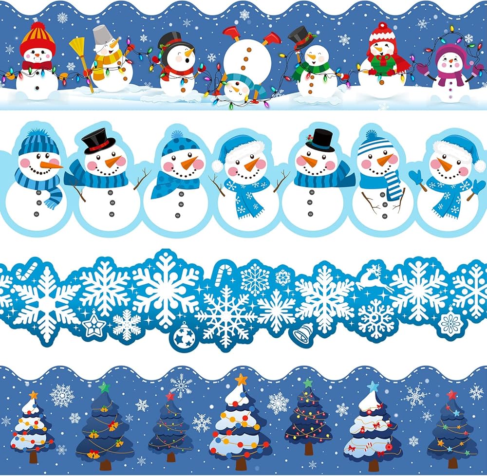 تصميم حدود عيد الميلاد: تم تصميم زخارف حدود سبورة الفصل الدراسي بأربعة خلفيات كرتونية جميلة مختلفة، مثل موضوع رجل الثلج، وموضوع ندفة الثلج المريحة، وشجرة عيد الميلاد اللطيفة وأكثر من ذلك، أنماط فريدة ولطيفة لافتة للنظر تمامًا وتبدو ستيريو، مما يجعل حدود نشرة عطلة الشتاء تبرز حقًا وتزيد من الأجواء الاحتفالية لفصلك الدراسي، مما سيجذب انتباه الطلاب ويزيد من أجواء الشتاء في الفصل الدراسي
