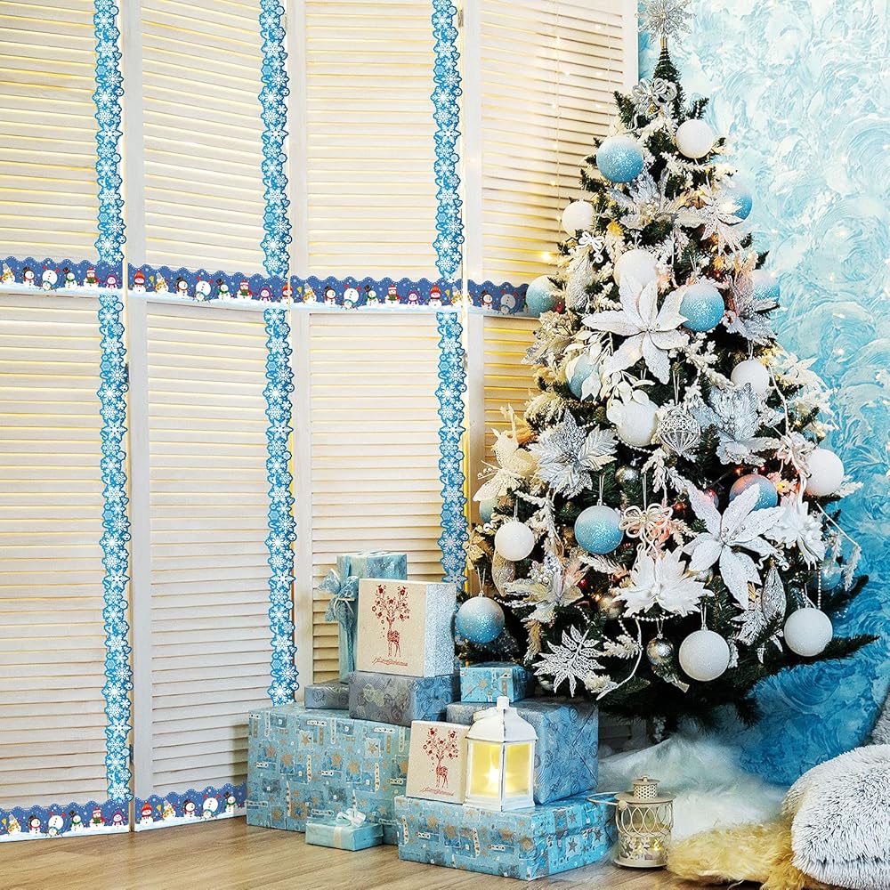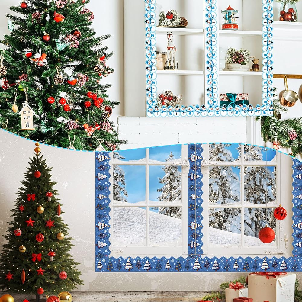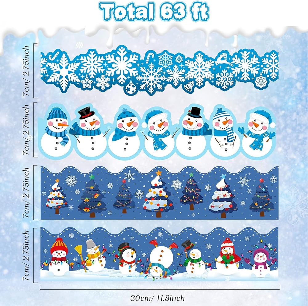 مادة موثوقة: مصنوعة من ورق بطاقات عالي الجودة بوزن 250 جرام، آمنة للاستخدام، حدود نشرات عيد الميلاد الخاصة بنا مجهزة بنقاط صمغ، سهلة اللصق والتقشير، يمكنك لصقها بسهولة على لوحة الإعلانات والسبورة السوداء والسبورة البيضاء؛ حدود النشرة على شكل ندفة الثلج تقريبًا. 2.75 × 11.8 بوصة والطول الإجمالي للحدود الشتوية 63 قدمًا؛ ملاحظة: يرجى الحرص على عدم غمره في الماء وإبعاده عن النار