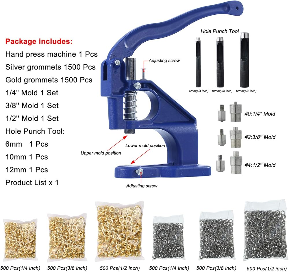 • Comes with 1500 pcs of silver grommets & 1500 pcs of golden grommets (500pcs of each size),the sizes are 1/4 inch, 3/8 inch, 1/2 inch, enough to meet your different DIY needs.