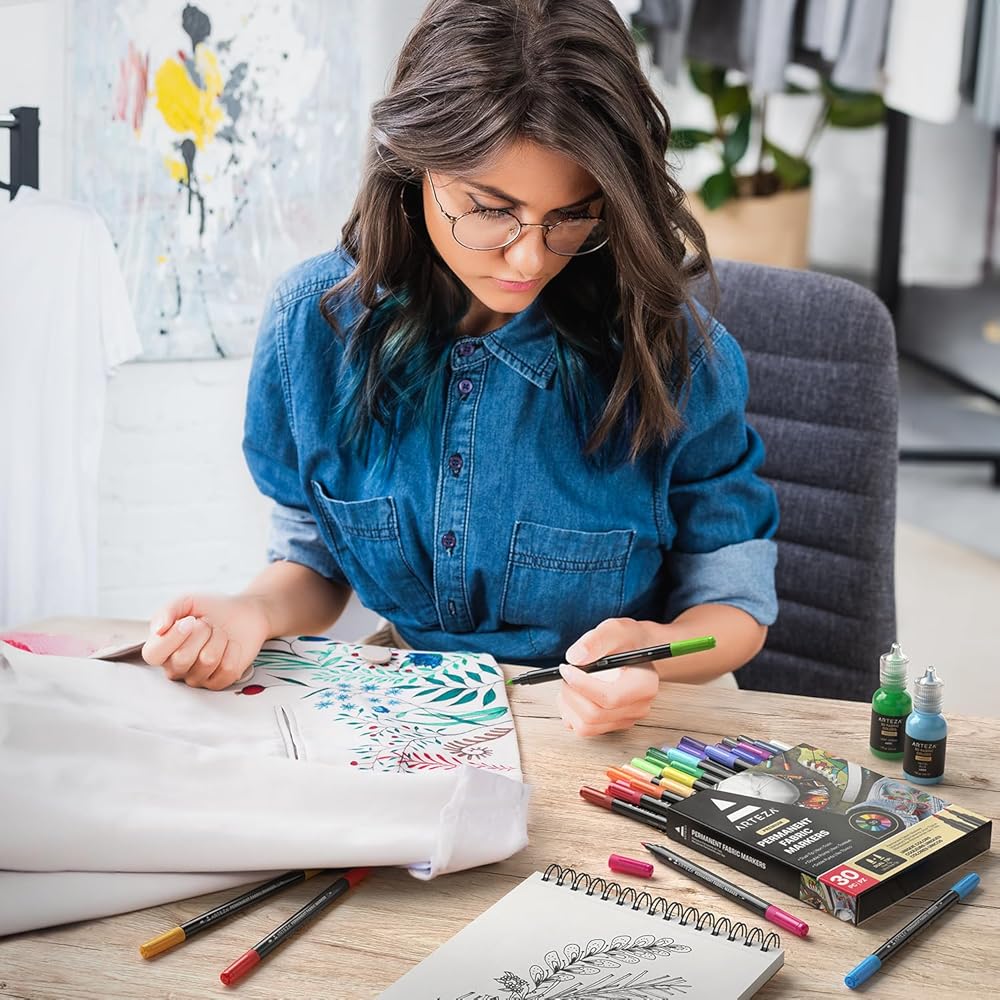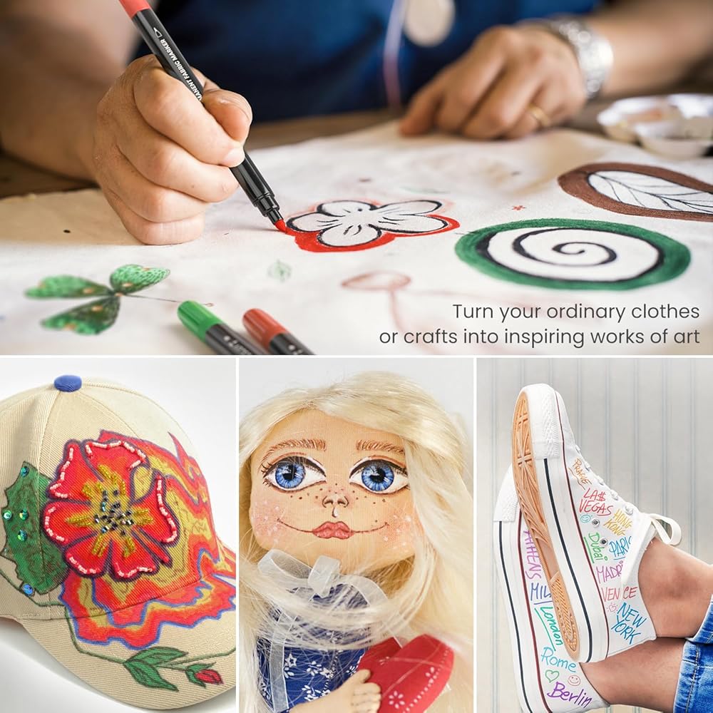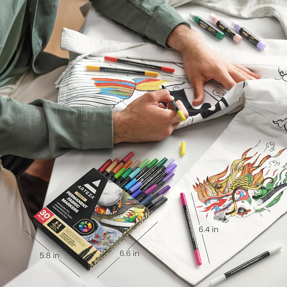 ستجد أن مجموعة أقلام التحديد الدائمة الخاصة بنا تحتوي على ألوان متنوعة فريدة تدوم طويلاً وستظل وتمزج بسلاسة على مشروعك الفني التالي على القماش. يحتوي كل قلم للملابس على صبغة نابضة بالحياة تدوم طويلاً ولن يبهت. الحبر الموجود في أقلام الحبر الأكريليك مقاوم للماء والتلاشي. للحصول على أفضل النتائج، نوصي بغسل الأقمشة في الماء الدافئ باستخدام منظف محايد.