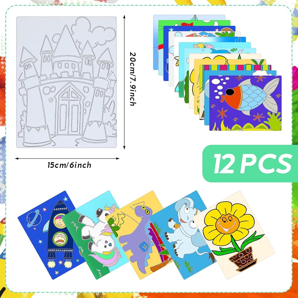مجموعة متنوعة من الأنماط: تتميز لوحات الرسم القماشية للأطفال بأنماط لطيفة، بما في ذلك القلعة والأسماك والديناصور والفيل والطائرة والزهور وأكثر من ذلك، رائعة ومثيرة للاهتمام، يمكن لأطفالك ببساطة التلوين وفقًا للأنماط، مما يسمح لهم ببناء الاهتمام بالرسم