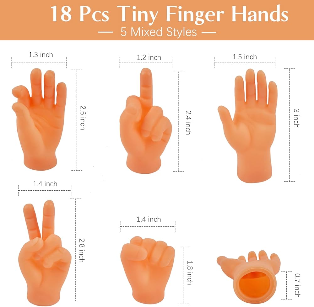 محتوى العبوة: سوف تحصل على 18 قطعة من الأيدي الصغيرة للأصابع. 5 أيادي يسرى، 5 أيادي يمنى، 2 قبضة، 2 إصبع للنصر، 2 يد بإصبع موافق و2 يد بإصبع وسطى. تتيح لك باقة الهدايا ذات القيمة الرائعة الاستمتاع بقدر ما تريد.