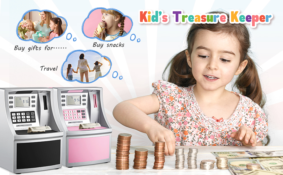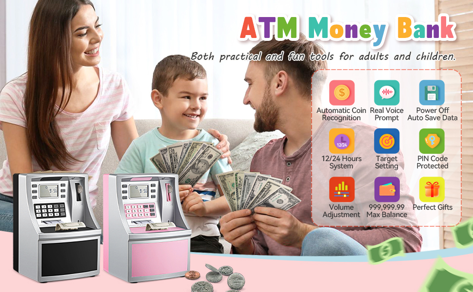 وظيفة الإيداع الذكي: تم تصميم هذا البنك الخنزير على شكل ماكينة الصراف الآلي للتعرف تلقائيًا على العملات المعدنية وحسابها، مما يضيف لمسة عملية للادخار. أدخل الأوراق النقدية، وسيتم سحبها تلقائيًا. يتم عرض كل إيداع على شاشة LCD وإضافته إلى رصيدك الإجمالي، مما يجعله مثاليًا لكل من الأطفال الذين يتعلمون الادخار والكبار الذين يديرون النفقات اليومية.
