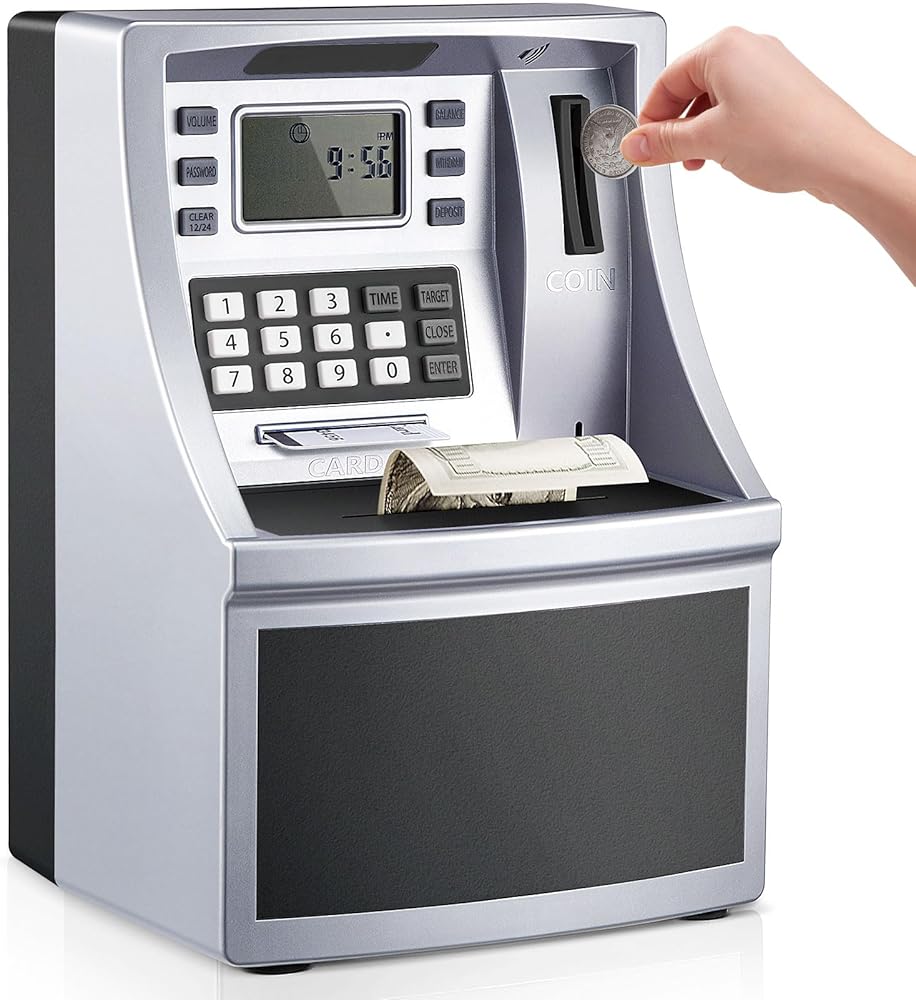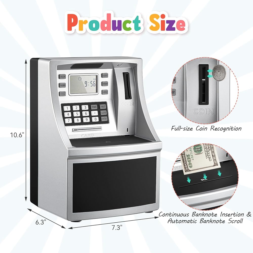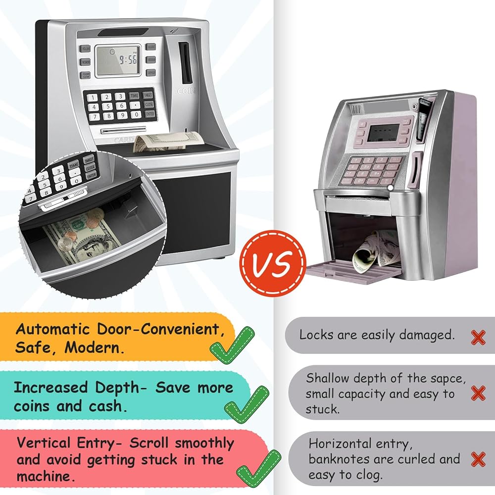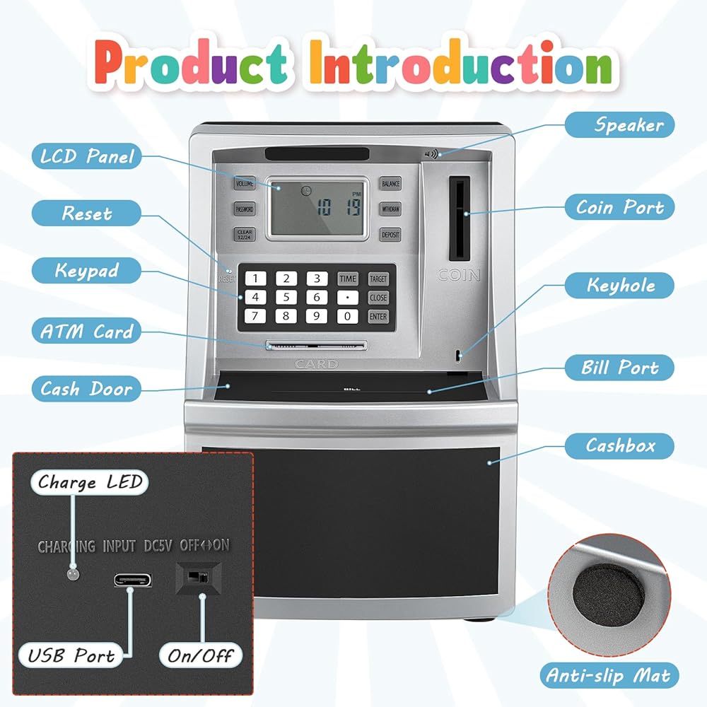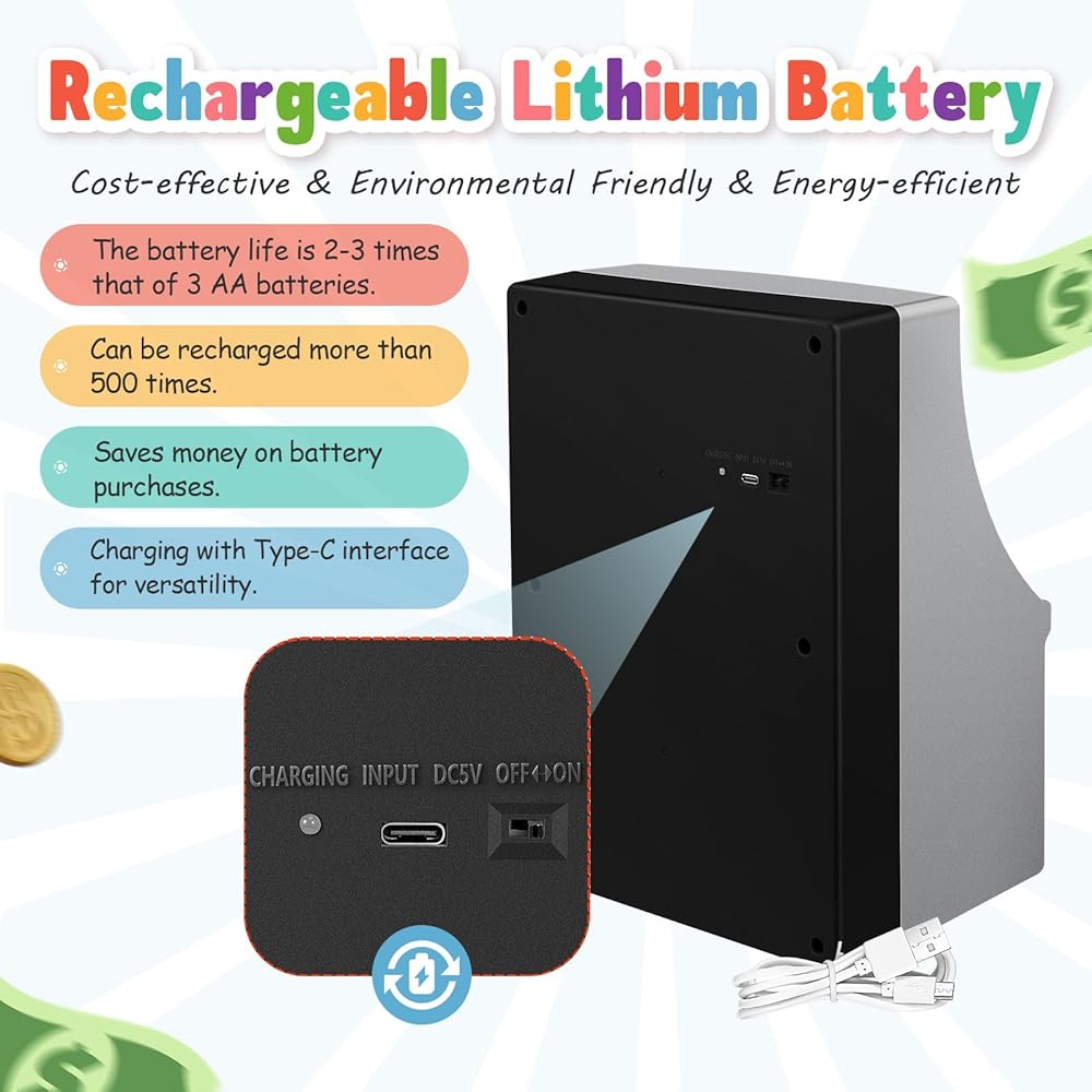 الخدمات المصرفية الآمنة المخصصة: استمتع بتجربة الخدمات المصرفية الشخصية المريحة مع ماكينة الصراف الآلي الصغيرة لدينا. ما عليك سوى إدخال بطاقة الخصم المقدمة وإدخال رقم التعريف الشخصي الفريد المكون من 4 أرقام للوصول الآمن. ترشدك الشاشة المضيئة والضوء الليلي المستشعر إلى إدارة مدخراتك، تمامًا مثل ماكينة الصراف الآلي الحقيقية للبنك.