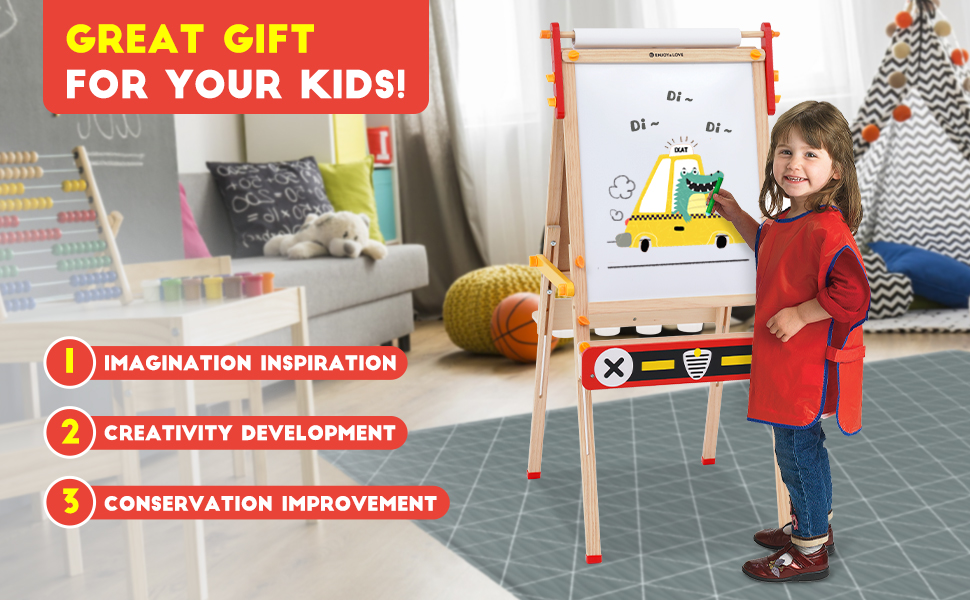 HIGH QUALITY --- This kids art easel uses high-quality logs. And it comes with non-slip foot cover, it's stable and safe for your kids. It will be a great gift for Christmas, Birthday, Children's Day for both boys and girls.