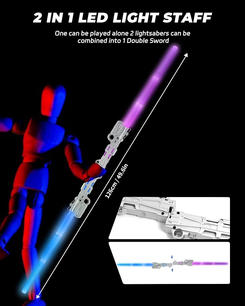2-in-1 DESIGN: Our children's toy lightsabers boast a dual-functionality with a finger gyro ring and a handle-mounted blade switch. This design enables effortless hilt spinning and blade projection for users of all ages. Furthermore, the connection of two illuminated swords forms an imposing double-bladed LED lightsaber, perfect for epic galactic showdowns.