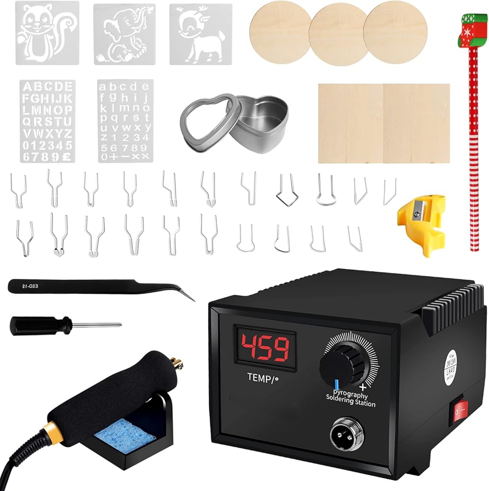 مجموعة المبتدئين: تتضمن مجموعة حرق الخشب مفك براغي وإسفنجة تنظيف وحامل أقلام. كاملة مع الملحقات، يمكنك البدء في صنعها على الفور. علاوة على ذلك، فإن مجموعة حرق الخشب هذه مجهزة بمقبض مقاوم للحرارة، وقلم لحام غير قابل للانزلاق ومقاوم للحرارة يزن 33 غرام فقط، تقنية سيراميك التسخين 60 واط للتسخين بسرعة في 20 ثانية فقط، بالإضافة إلى باكليت مقاوم للحرارة يمنع توصيل الحرارة إلى قضيب القلم.