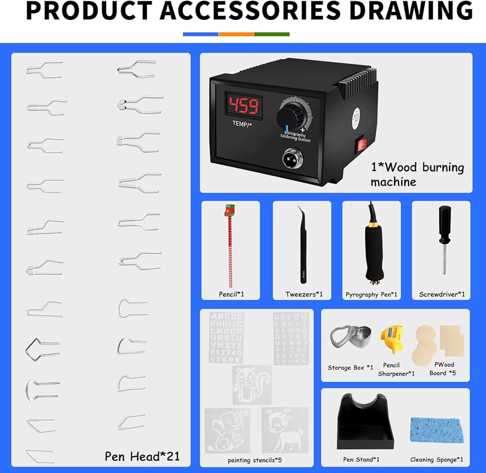 - مجموعة المبتدئين: تتضمن مجموعة حرق الخشب مفك براغي وإسفنجة تنظيف وحامل أقلام. كاملة مع الملحقات، يمكنك البدء في صنعها على الفور. علاوة على ذلك، فإن مجموعة حرق الخشب هذه مجهزة بمقبض مقاوم للحرارة، وقلم لحام غير قابل للانزلاق ومقاوم للحرارة يزن 33 غرام فقط، تقنية سيراميك التسخين 60 واط للتسخين بسرعة في 20 ثانية فقط، بالإضافة إلى باكليت مقاوم للحرارة يمنع توصيل الحرارة إلى قضيب القلم.
