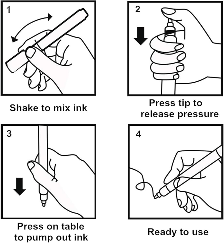 • سهل الاستخدام: اقلب طرف القلم لأعلى وهز القلم. اضغط الطرف لأسفل بلطف لفترة من الوقت على الورق حتى يتدفق الحبر إلى الطرف. للحصول على تأثير لون أفضل، أعد تغطية أقلام التحديد مباشرة بعد الاستخدام وخزنها أفقياً.