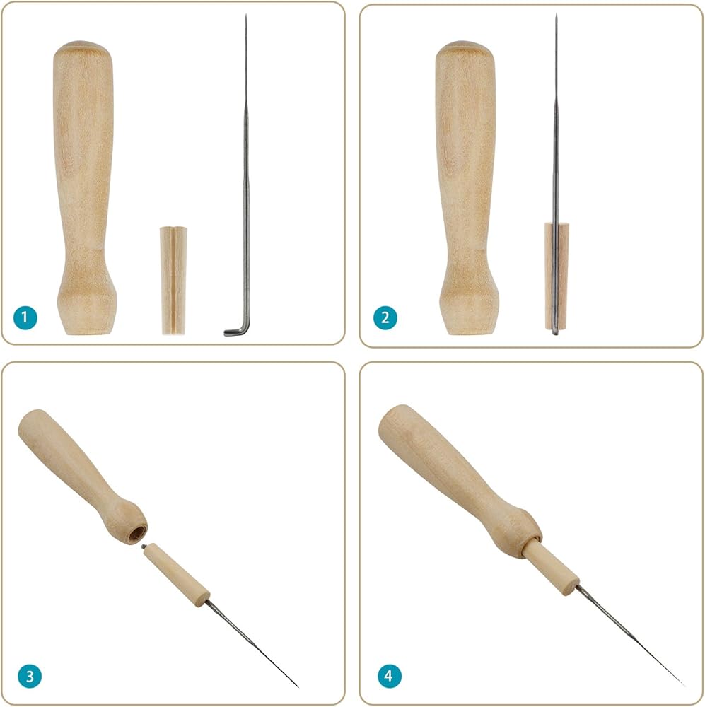 3 Felting Needles Wool Instruction:You need to slip the needle into the slot in the wood holder with the hook at the bottom, and you should pay attention to which end you insert it into as the piece is tapered, and you need the handle end of the needle to be at the smaller end of the holder, then insert the smaller end into the bottle.