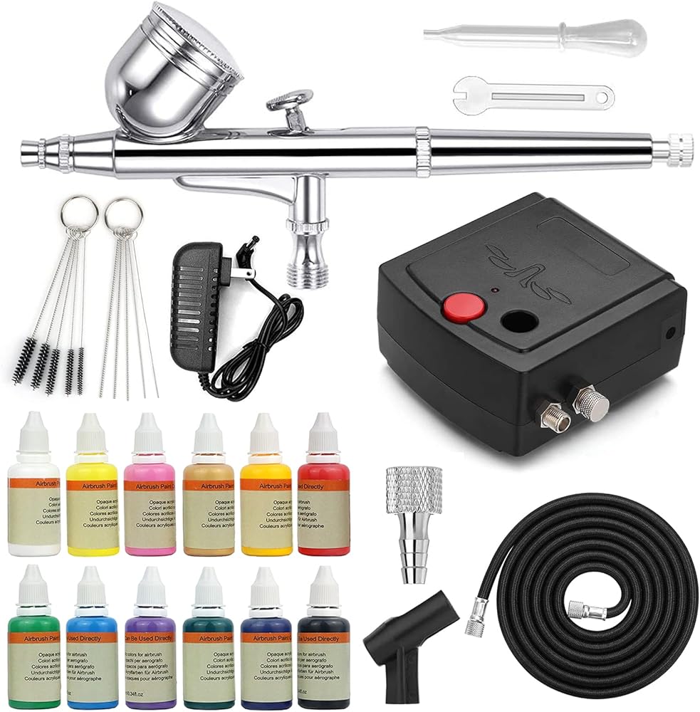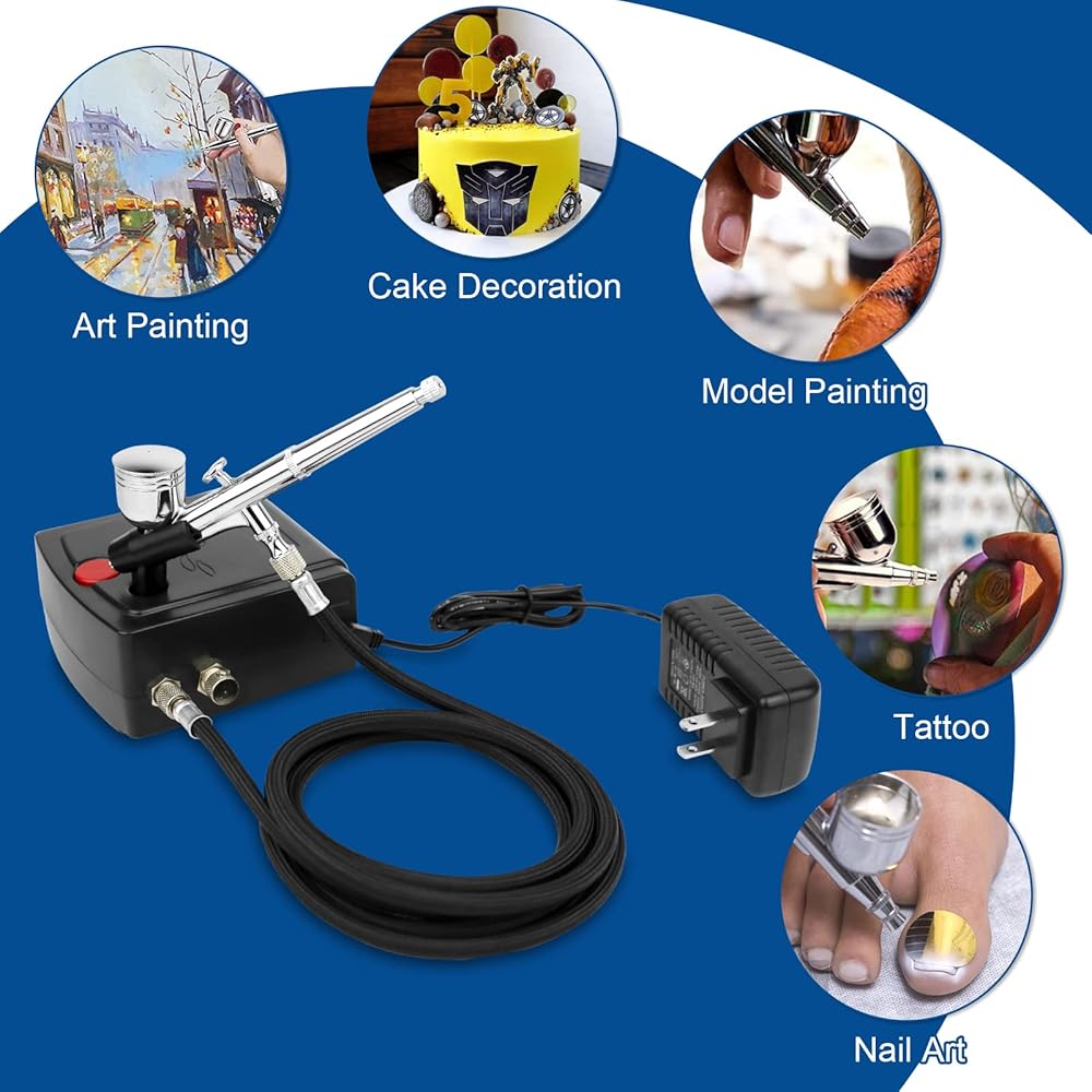 مجموعة نظام البخاخة الكاملة للاستخدام المبتدئ والاحترافي. استخدم على نطاق واسع فرش الهواء هذه لنماذج الطلاء وأحذية الطلاء، كما استخدم مجموعة ايربورش هذه للماكياج وتزيين الكيك وأكثر من ذلك. ولكن لا يمكن استخدام طلاء الفرشاة الهوائية المتضمن للطعام والأعمال الفنية للجسم.