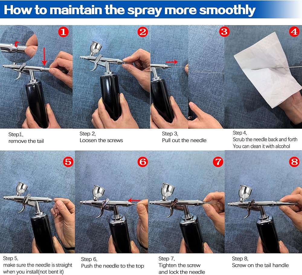 🏝️ضغط ثابت ورذاذ دقيق🏝️ قلم البخاخة هذا ذو حركة واحدة يمكن أن يحصل على خط رش أفضل ودقيق. قم بتجميع مسدس الفرشاة الهوائية على جسم آلة البخاخة، وادفع الجزء السفلي من الجسم للتشغيل، والآن سيخرج الهواء أولاً، وإذا قمت بسحب الزناد للخلف، ثم أخرج رذاذ البخاخة.