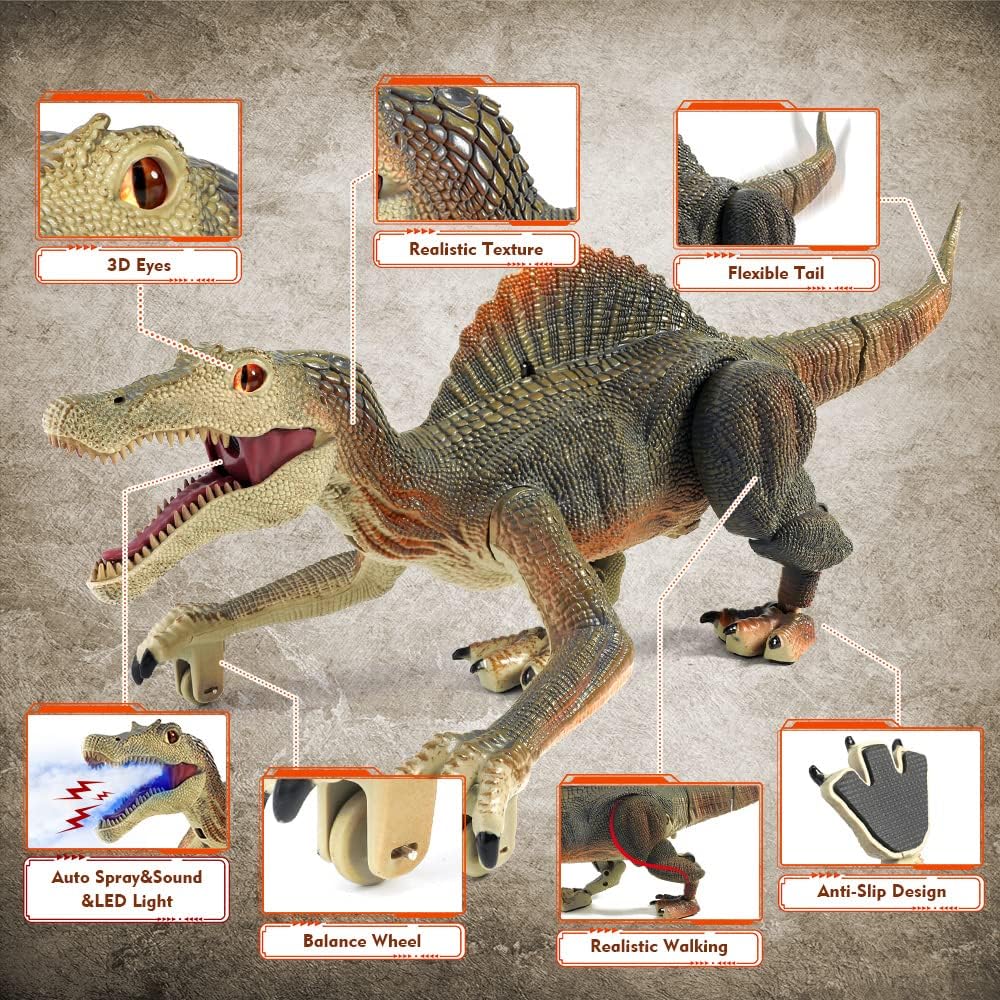 Realistic Walking RC Dinosaur-The remote control dinosaur toys for boys 8-12 features with lifelike spinosaurus appearance and texture,vivid 3D eyes,the balanced wheels of foreleg,anti-slip paw,shake tail,multiple joints and movable part to support it to walk flexibly and realistically. It will motivate kids come forward to explore the dinosaur civilization of the cretaceous period.