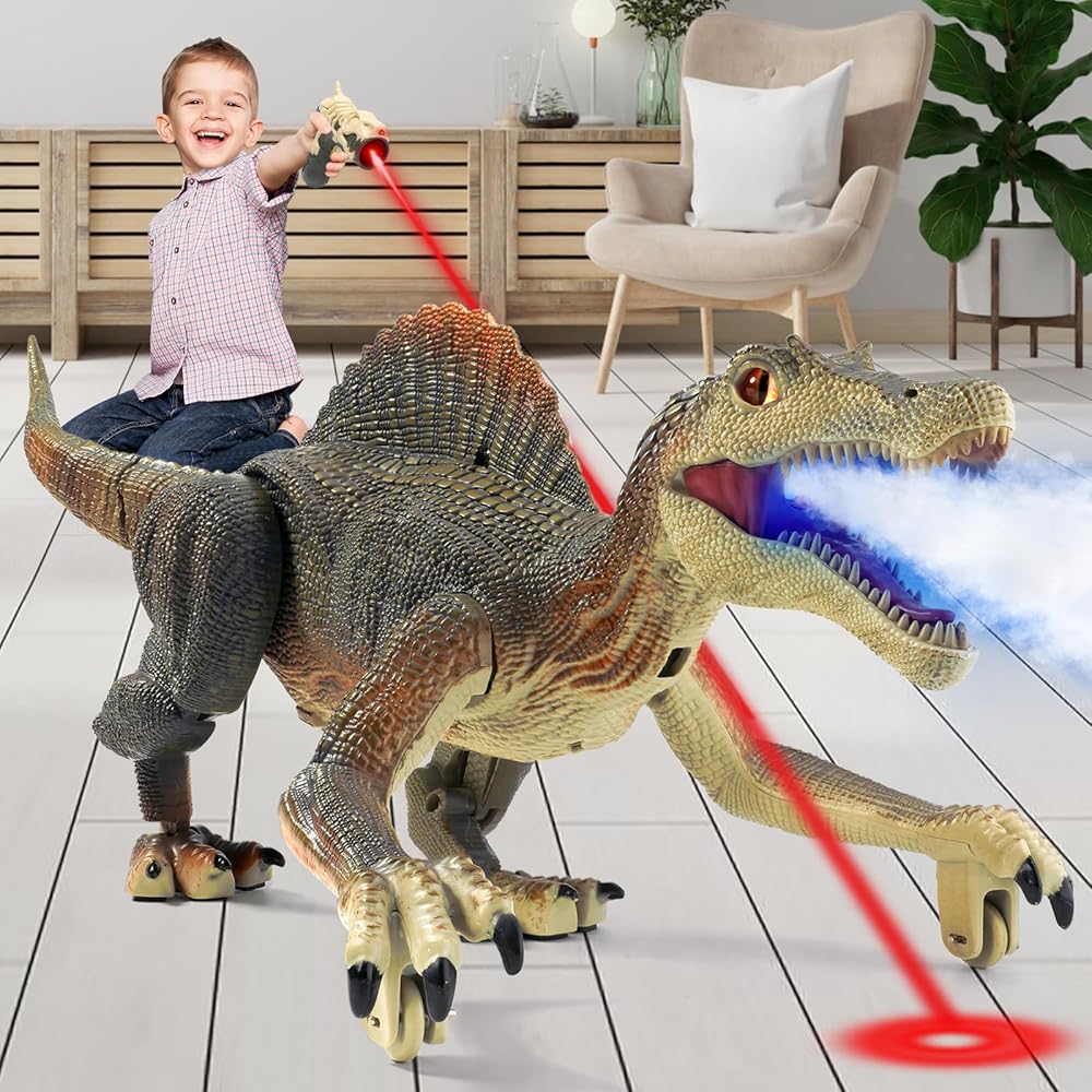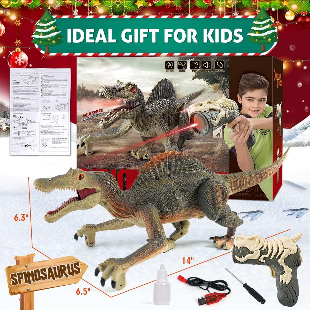 Jurassic Spinosaurus Dinosaur Toys-Pull the trigger on the remote control to shooting light to mark the target,the grey flexible spinosaurus dinosaur robot toy will raise its legs and run like a realistic dinosaur step by step to chase and attack the dinosaur with sparkling blue Led light,loud roaring and auto spraying from the mouth. What a crazy chasing&survival game! They earn a spot on the jurassic forest by its power.
