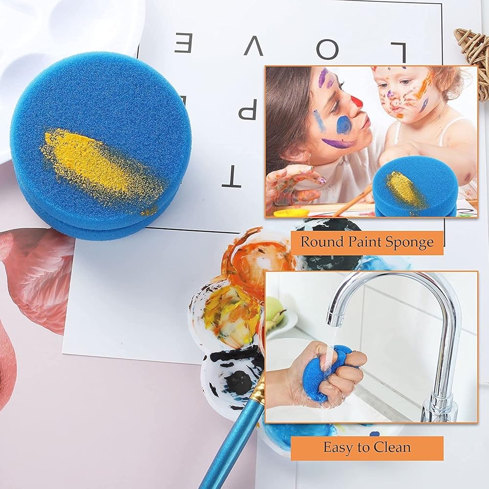 ✅【DOUBLE-LAYER DESIGN】The size of each round paint sponge is 3.2 inches x 1.9 inches. Ergonomic double-layer painting sponges with round notches/groove make it easy to grab, suitable for most art painting and cleaning projects.