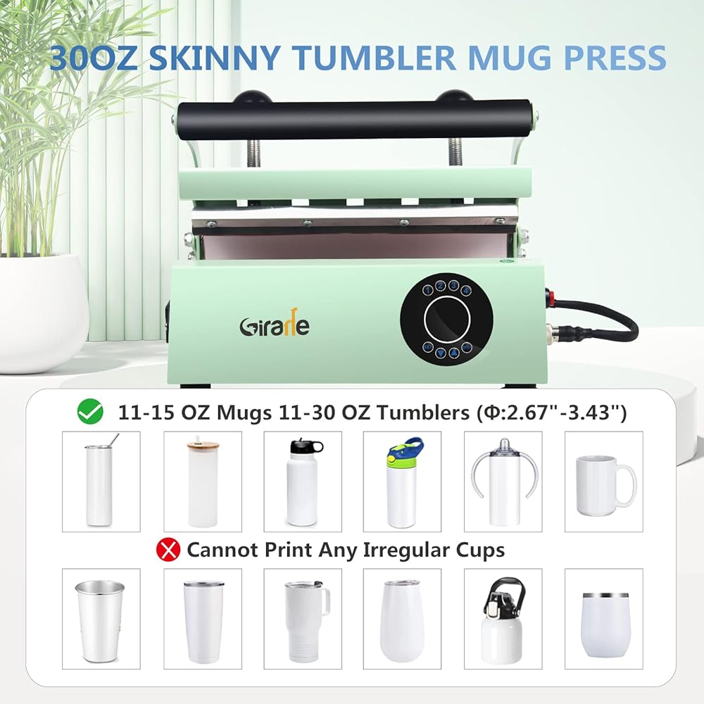 🎁【آلة ضغط الأكواب المطورة】مناسبة للأكواب سعة 11-15 أونصة والأكواب سعة 11-30 أونصة والزجاج وزجاجة المياه (أي أدوات شرب بقطر 2.67 بوصة - 3.43 بوصة)، لا يمكن طباعة أي أكواب غير منتظمة. آلة التسامي بالضغط على البهلوانات هذه عبارة عن مكبس حراري رقمي يتيح لك طباعة تصميماتك مباشرة على الأكواب التي ستشرب منها.