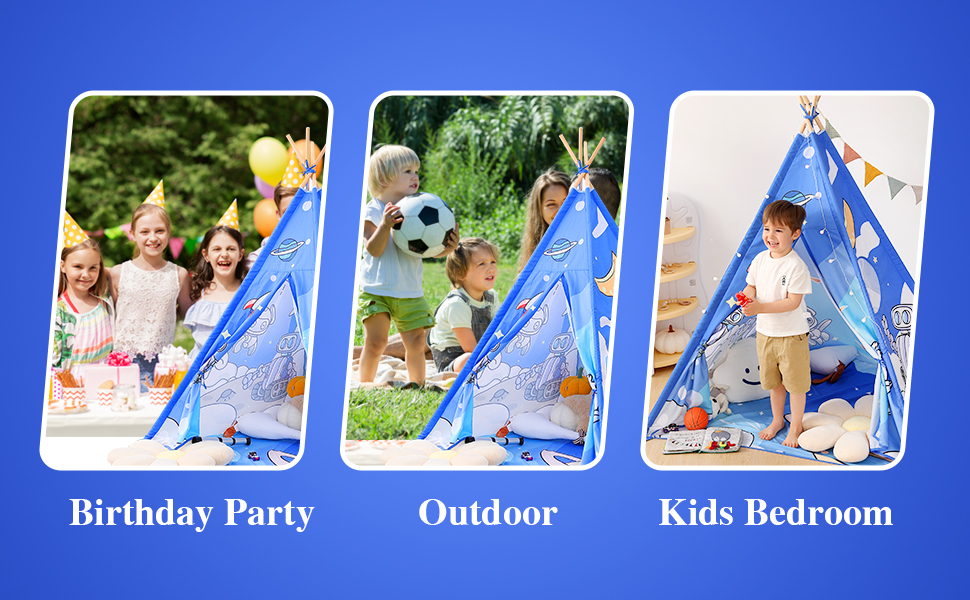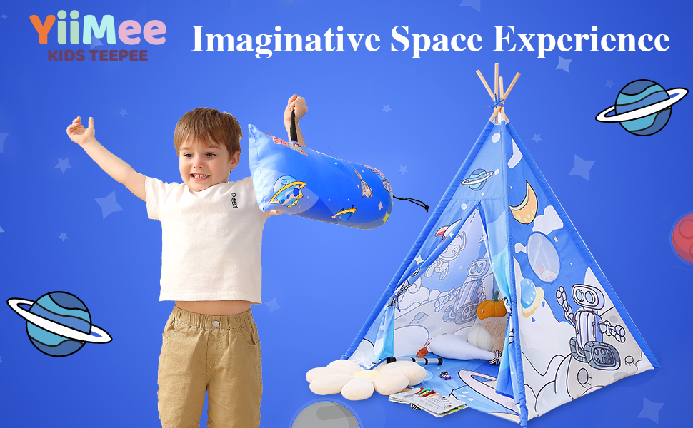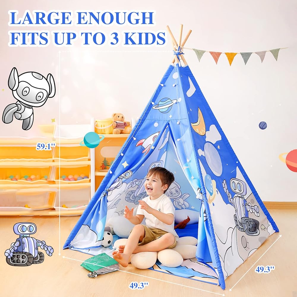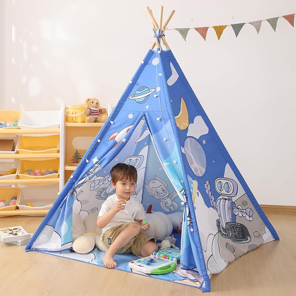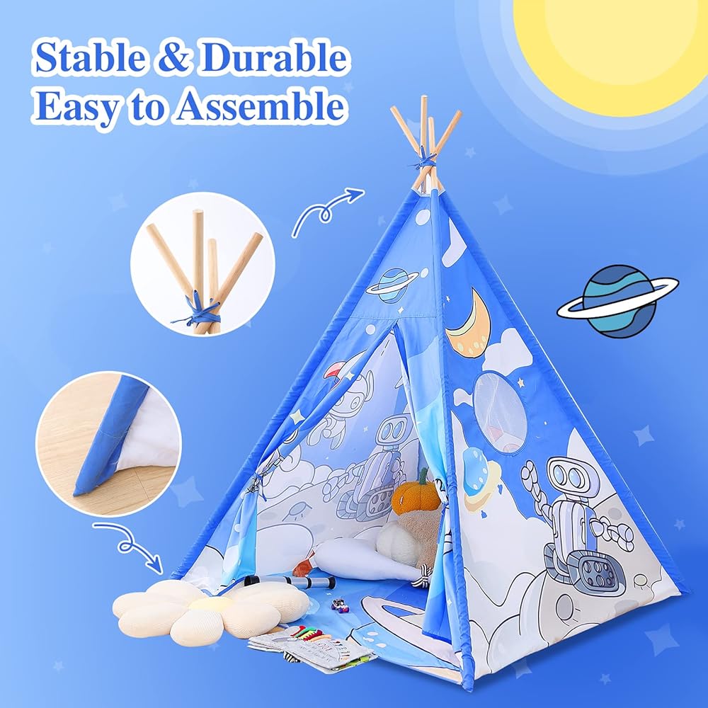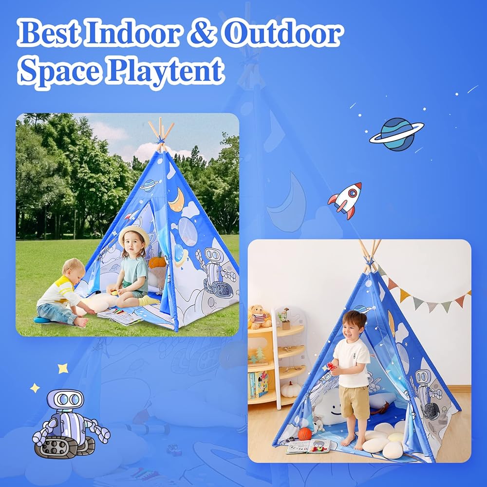 [Skin-Friendly & Sturdy] - The teepee that little astronauts live in must be safe and sturdy. The material of the tent is odorless and BPA free, providing a comfortable environment for children. The frame is made of 100% log, strong and durable. The fabric is easy to clean, and if it gets dirty while using it outdoors, it can be easily cleaned with water and soap.